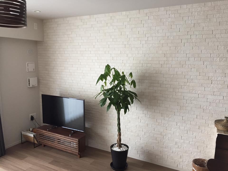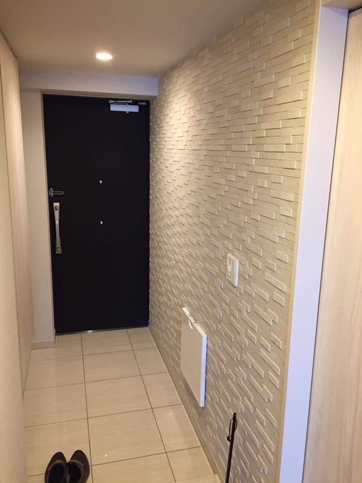 玄関とリビングに「エコカラット」を貼りました。 リビングが「グラナス ヴィスト」で、玄関が「ランド(土もの調)」です。 グラナスヴィストはやわらかい表情のある壁面が、贅沢感のあるナチュラルな空間を演出します。壁全体に貼ることでとてもシックなリビングになりました。 ランド(土もの調)は土もの調の素材感により、こちらもナチュラルな空間を演出します。床や玄関収納と同じ系統の色に揃えることにより統一感が生まれます。 エコカラットプラスなので、調湿する壁なのに水拭きができるので、お掃除が簡単です。