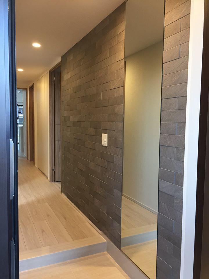 リビングにはLIXIL エコカラットプラス「ビンテージオーク」、玄関にはLIXIL エコカラットプラス「ラフクォーツ」をご選定いただきました。玄関には鏡も設置しました。
