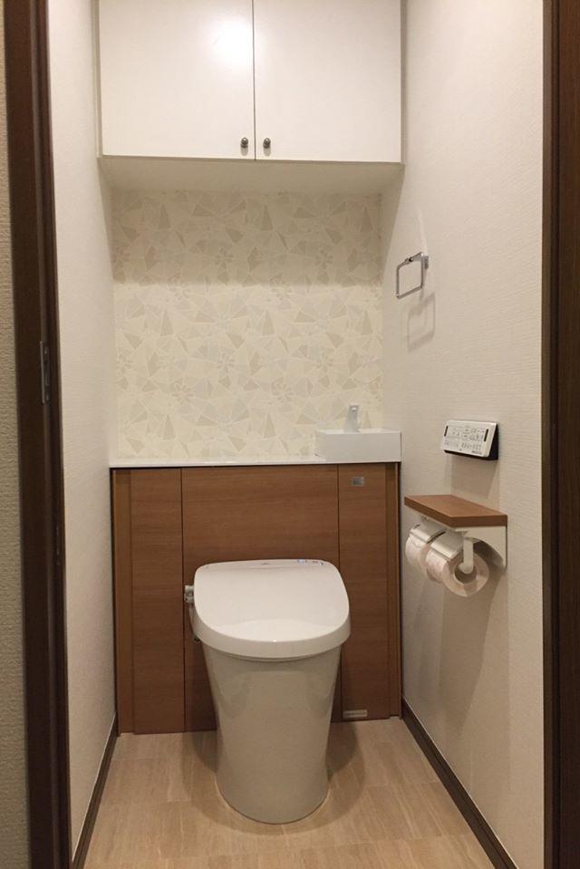 LIXILキャビネット付トイレ「リフォレ」をご選定いただきました。 当初エコカラットを希望されていたのですが、予算の関係でやめたこともあり、アクセント壁紙を提案しました。正面だけを控えめな花柄をいれてアクセントとしました。奥様がすごく悩んで決めた壁紙でしたが、喜んでいただけました。その他の事例はこちら
