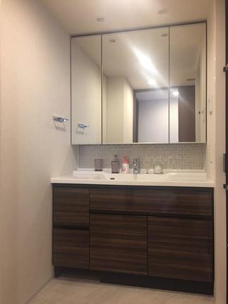 ガラスモザイクルキアグラス LUC1:ミラーキャビネットと本体の間にタイルを貼り、洗面化粧台に一体感を持たせました。
