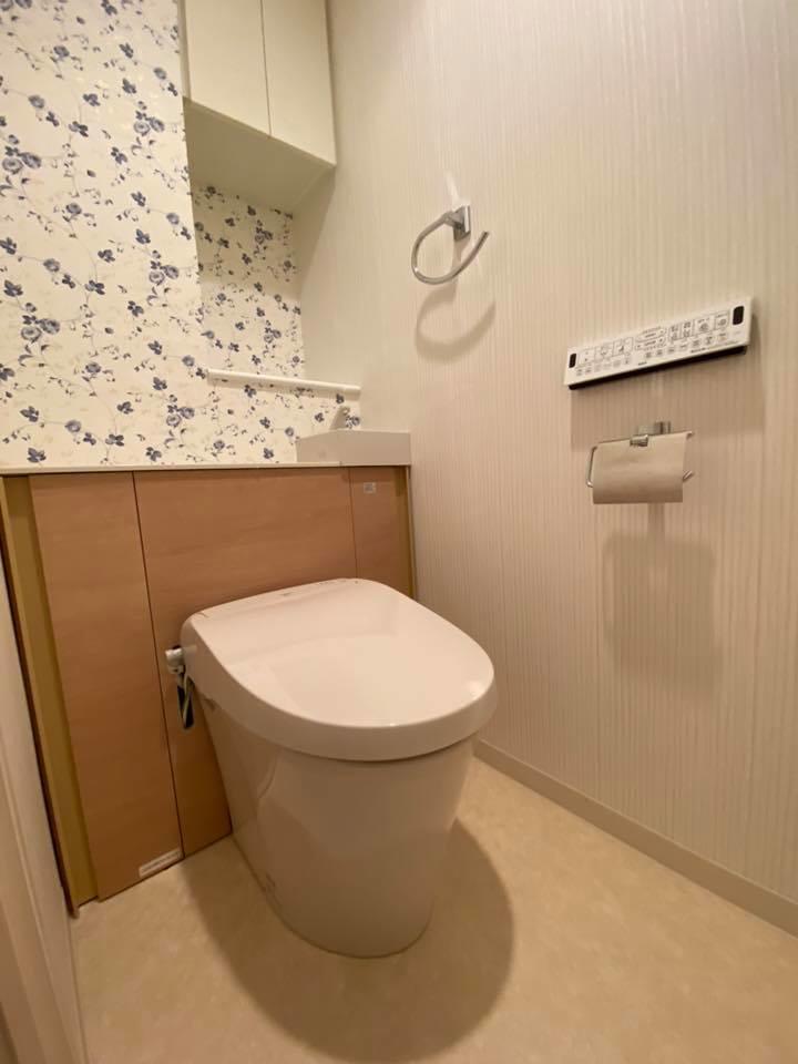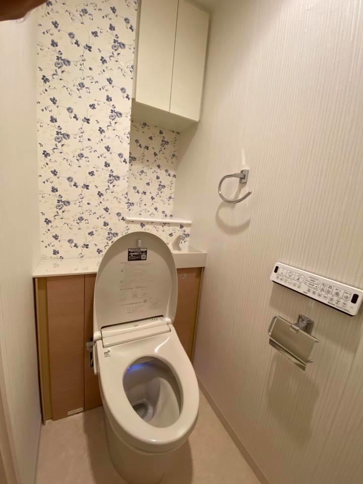 LIXILキャビネット付きトイレ「リフォレ」をご選定いただきました。 リフォレは大規模な工事が必要なくパッと交換できます。 壁クロスの柄は母娘でじっくりと拘って選定されました。 花柄がトイレ空間を明るくします。その他の事例はこちら