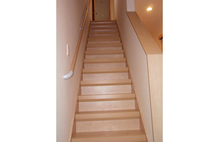 既存の階段を壊さず重ね貼りできるLIXILのリフォーム階段。廃材が出ず、エコでコストを押さえた施工ができました。手すりも新しく交換しました。
