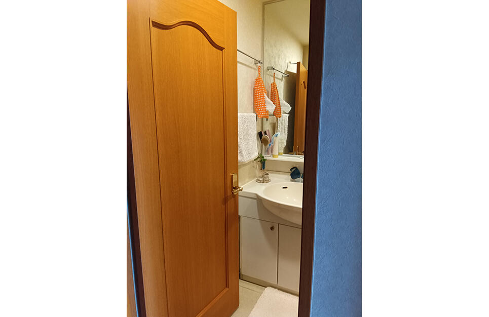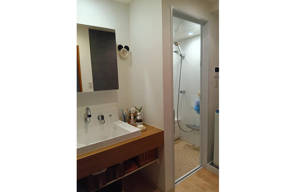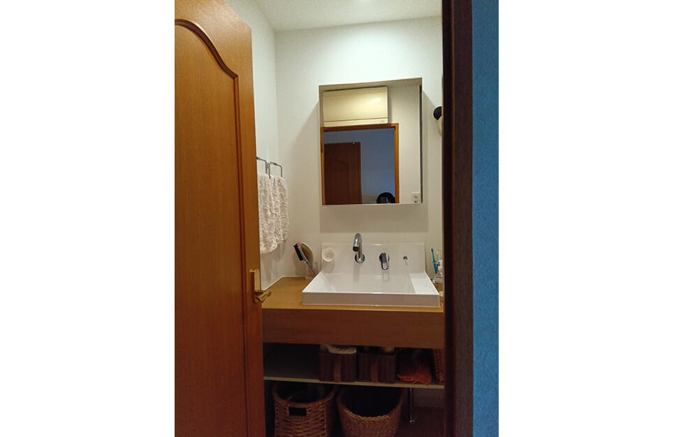 洗面室入口のドアと洗面化粧台の下台の扉が干渉してしまうので、カウンター式の洗面台をご提案しました。 お客さまのご要望で、カウンターの高さを少し上げて設置しました。