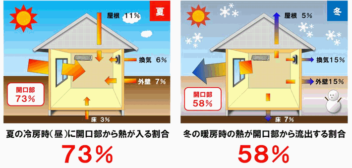 住宅の中でも最も熱の出入りが大きいのが窓、ドアなどの開口部。