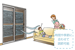 採風タイプの雨戸なら、可動部を調節し、雨戸をしめたまま視線を遮りながら、風と光りが取り込めます。