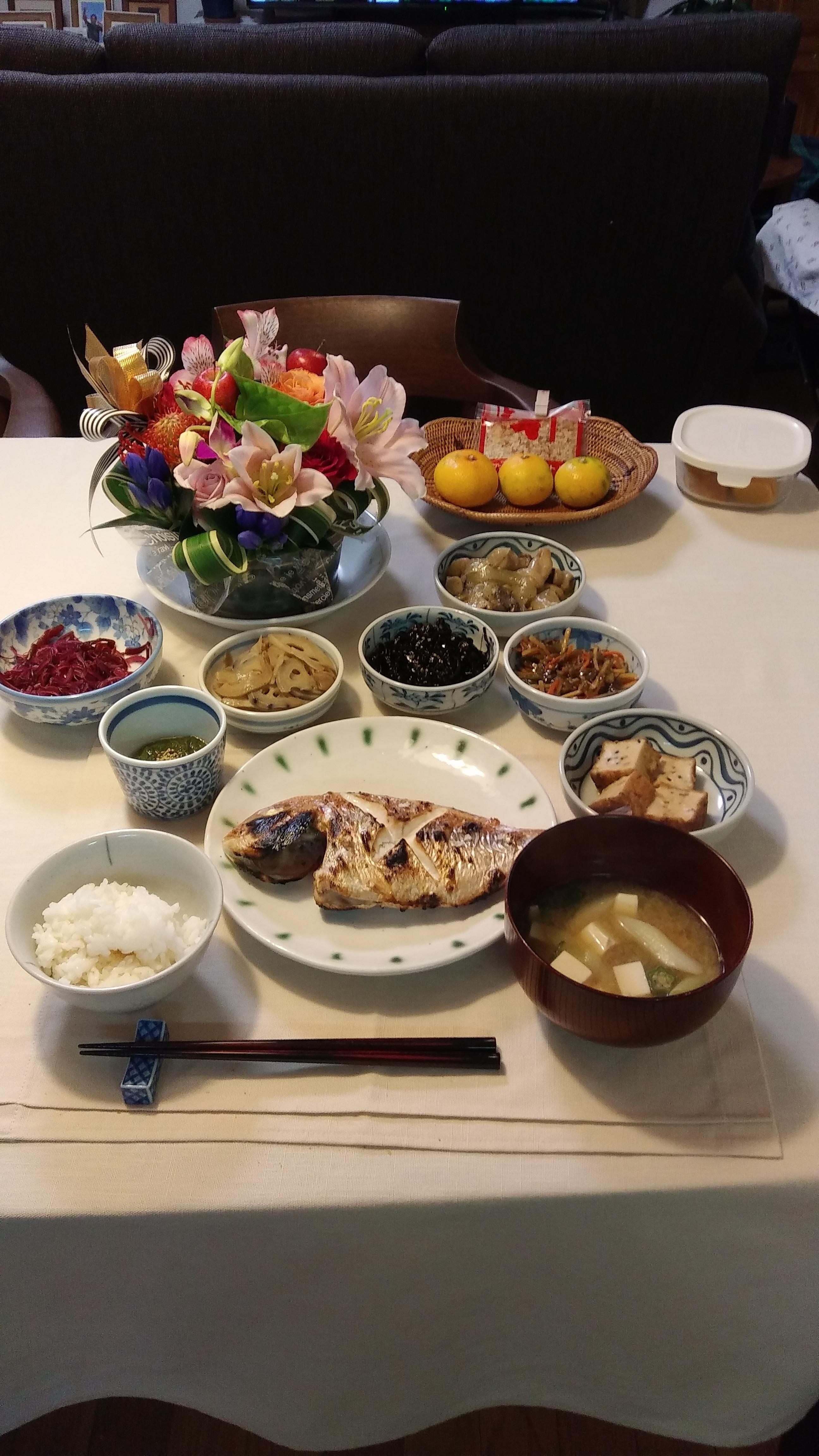 旦那さんのお誕生日だったので、鯛の塩焼き、お頭付きでお祝いしました♪