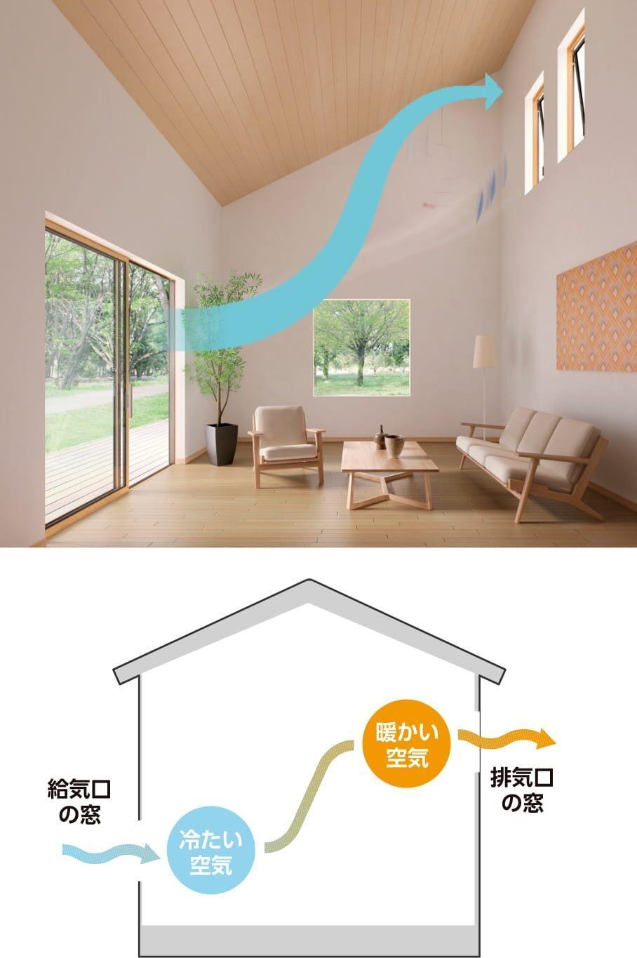 また暖かい空気の上に行くという特性を利用することで、無風状態でも空気の流れをつくることが出来ます。