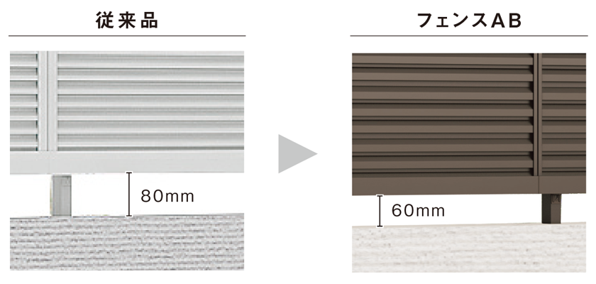 フェンスの下空き寸法は、すべてのタイプで従来よりも狭い60mmを採用。
