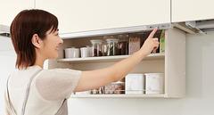 LIXILのダウンウォールならスイッチひとつで自動的に棚が垂直に昇降します。