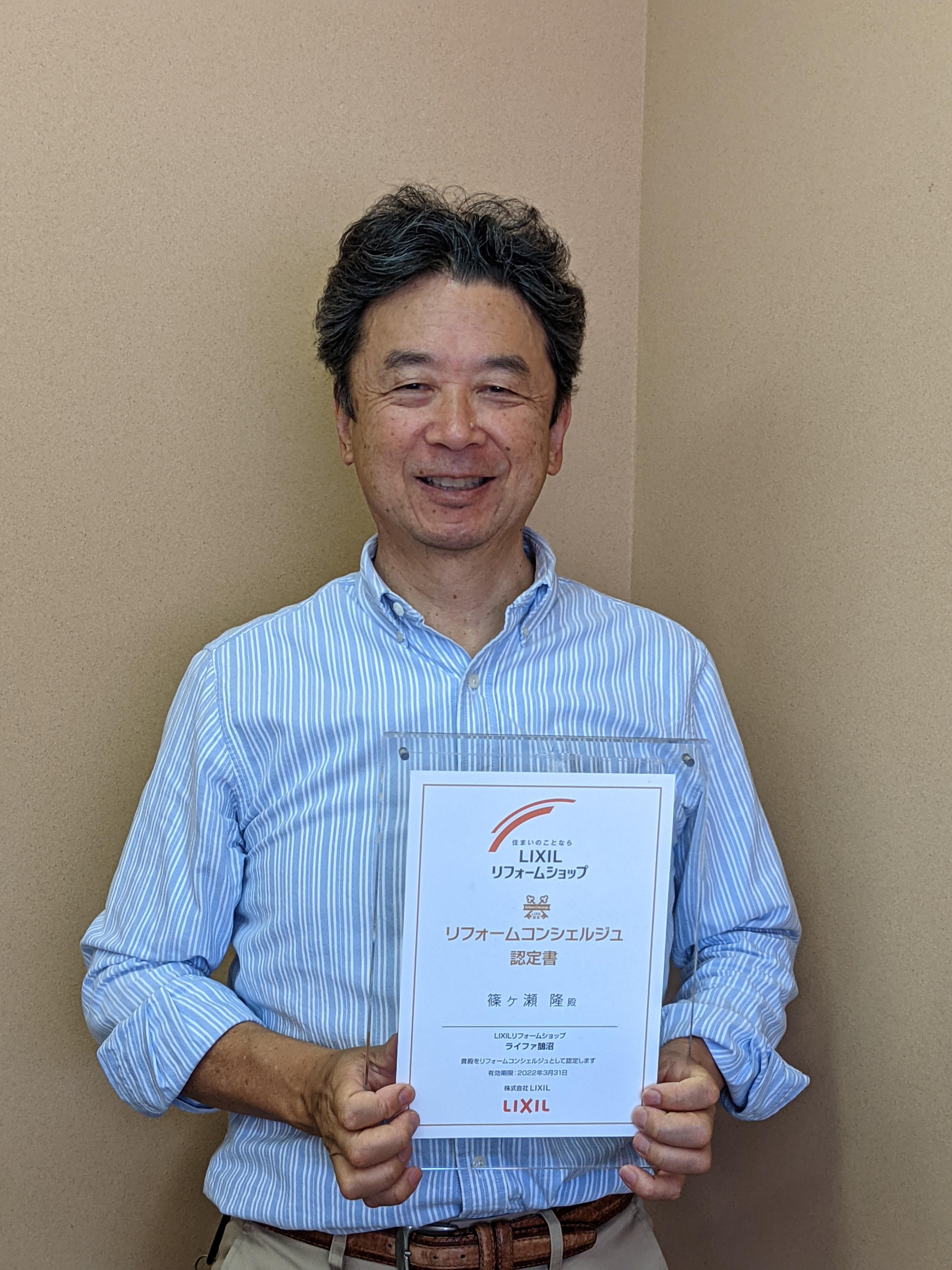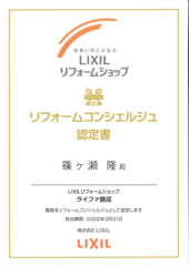 ライファ鵠沼社長、篠ケ瀬隆がLIXILの「リフォームコンシェルジュ」に認定されました。