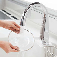 手を使わずに水が出て、シンク作業がスイスイはかどる水栓です。