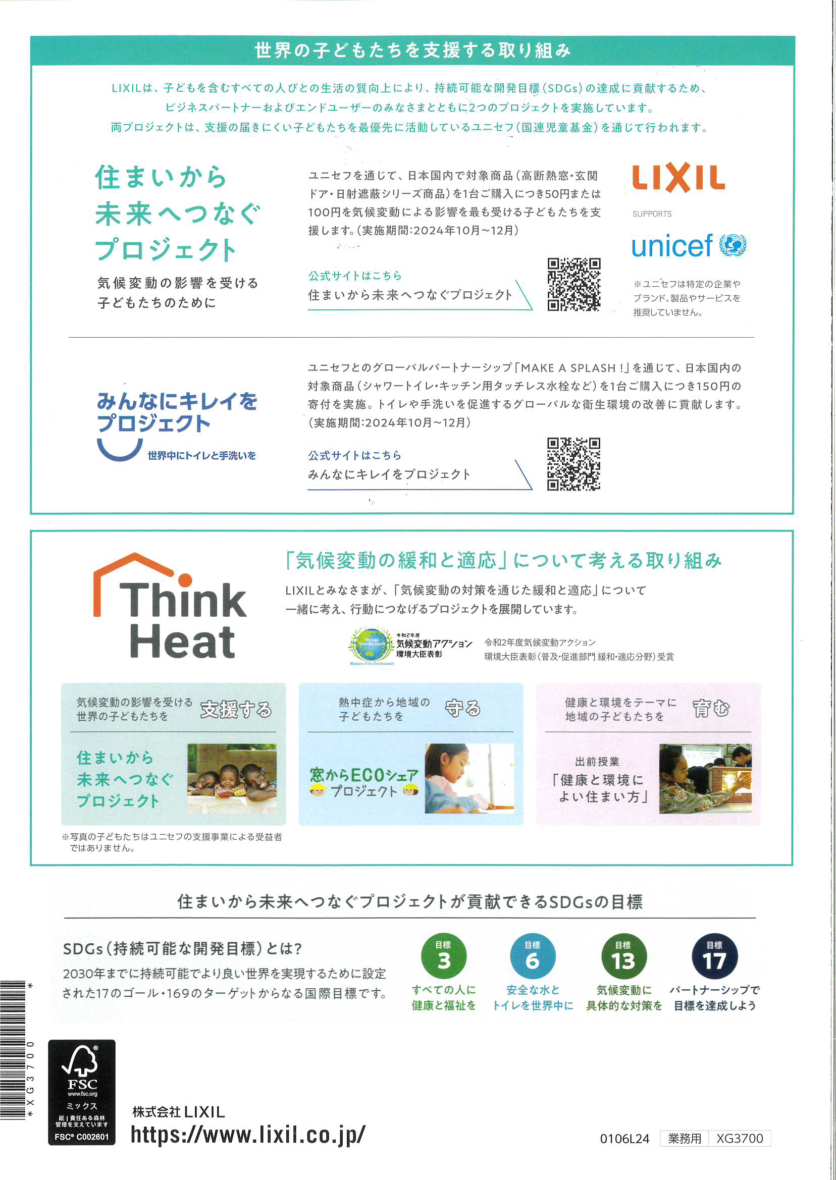 リクシルではユニセフとのグローバルパートナーシップ 「MAKE A SPLASH!」を通じて、日本国内の対象商品(シャワートイレ、キッチン用タッチレス水栓など)を1台ご購入につき150円の寄付を実施。トイレや手洗いを促進するグローバルな衛生環境の改善に貢献します。