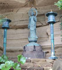 大本堂前の「浄行菩薩」(じょうぎょうぼさつ)にお水をかけて、病気を治して欲しい所をタワシでこすります。