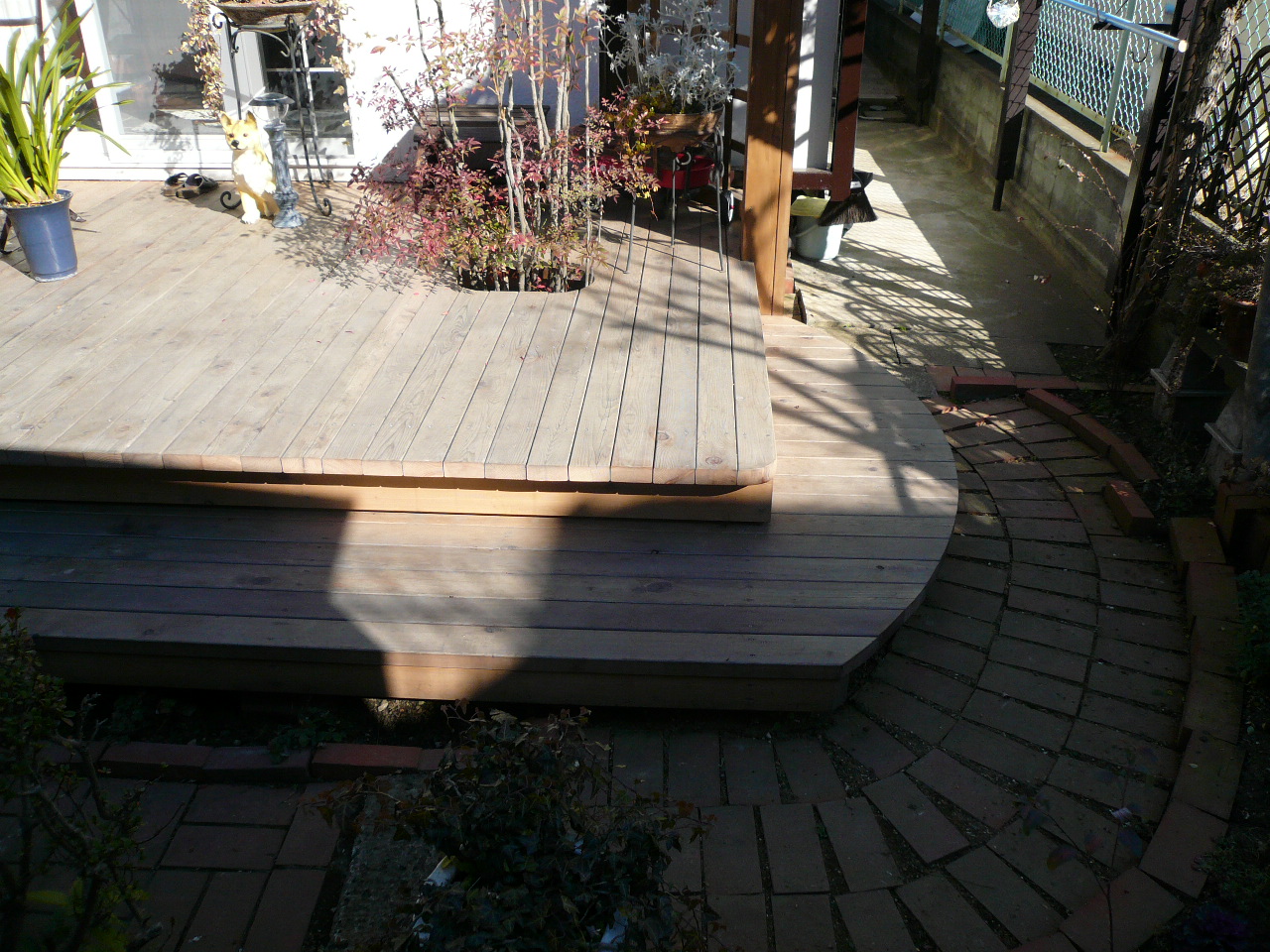 古くなったウッドデッキの改修工事です。 回りにレンガを敷き、丸くデザインした段を付けて 敷地に合わせています。