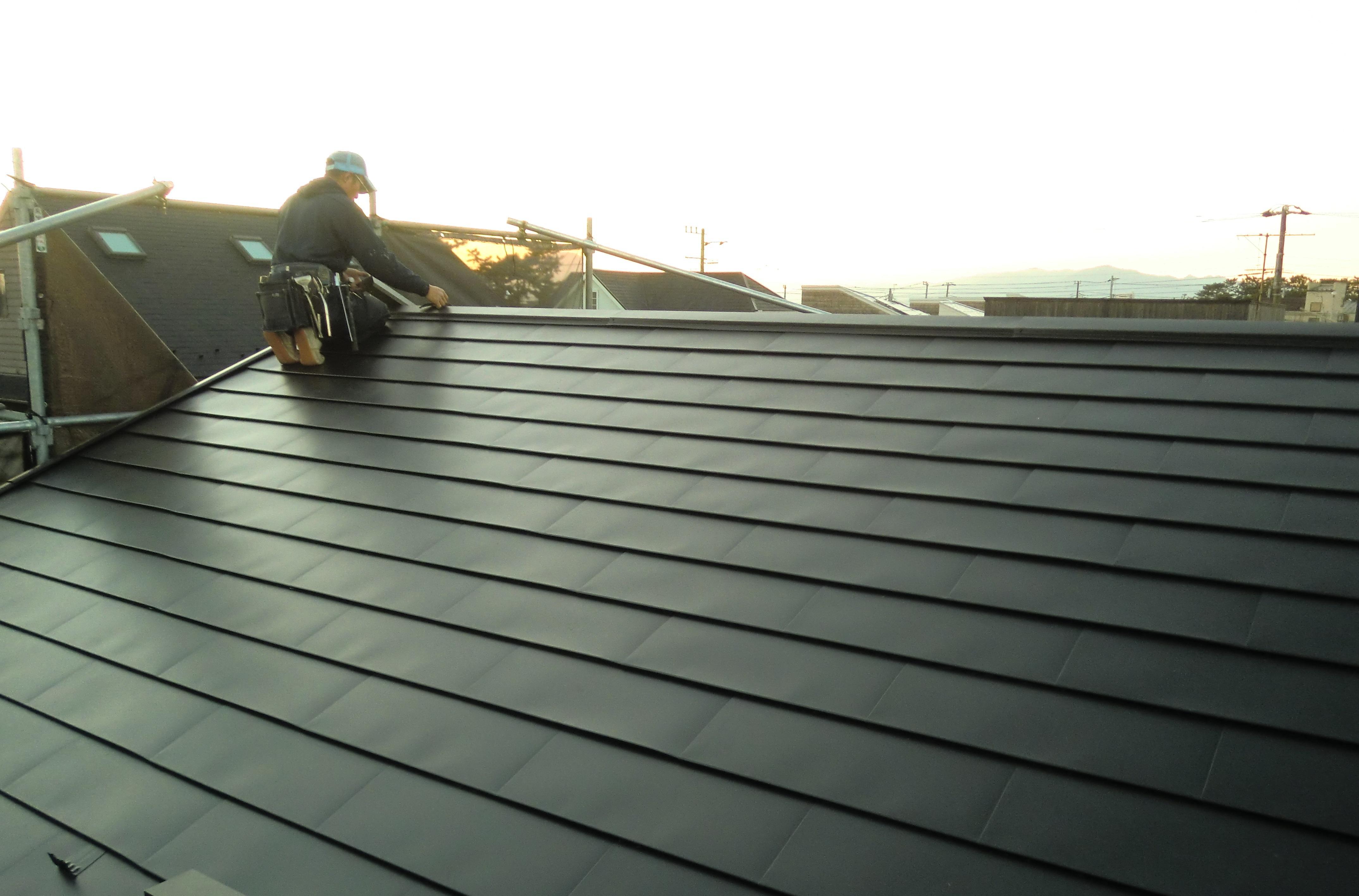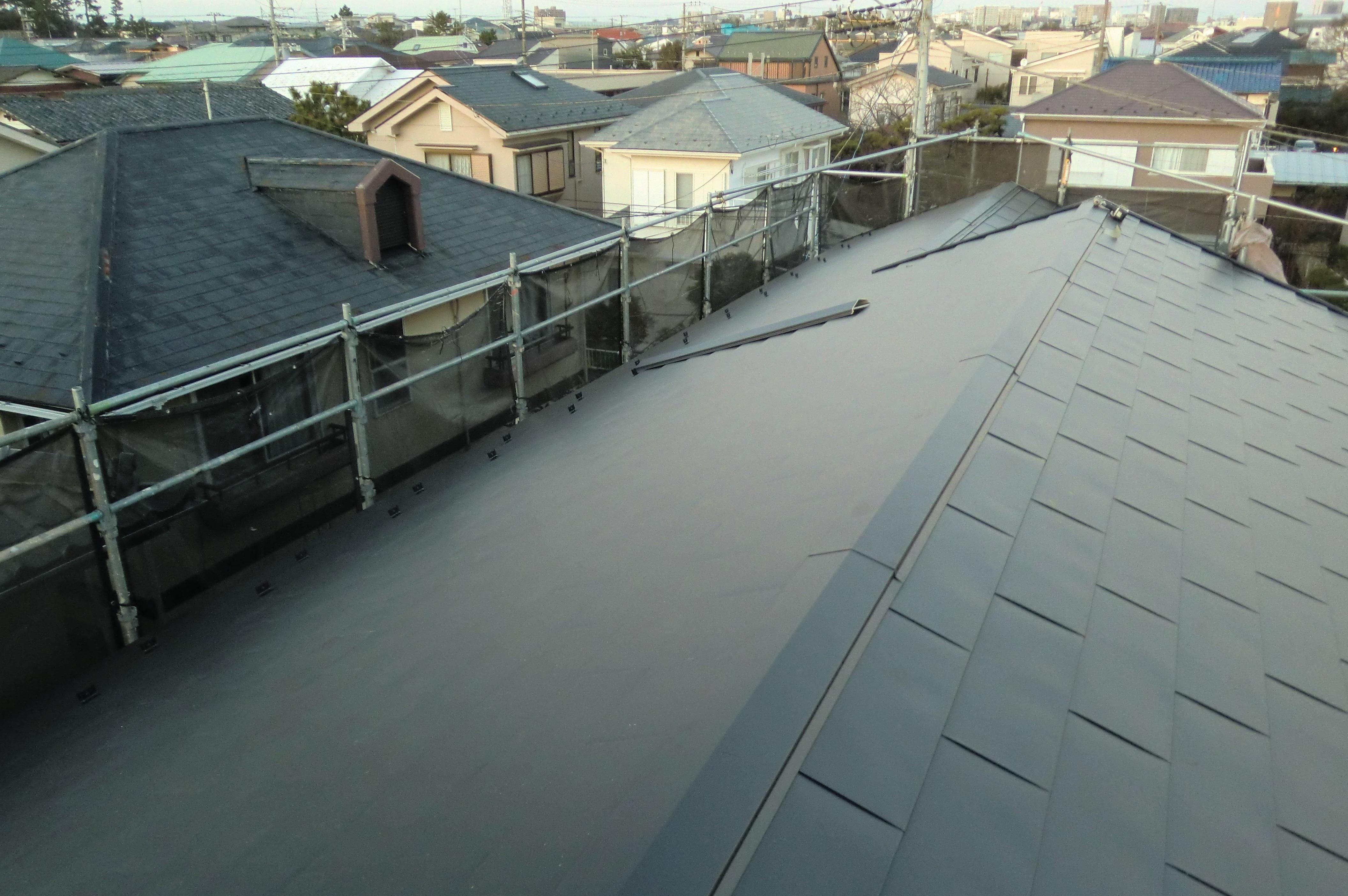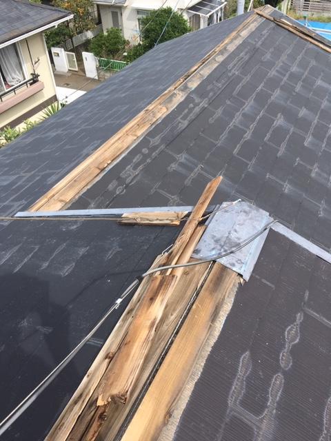 2019年の台風15号で屋根の棟が飛ばされ、19号であやしかった軒天井のベニヤが大きく剥がされてしまったため、屋根は棟を含め全体全体を重ね葺き、軒天井はケイ酸カルシウム板を重ね張りし塗装しました。