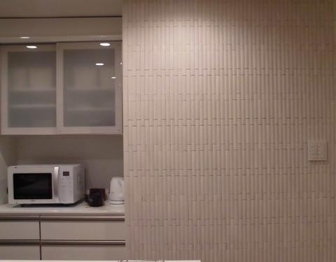 奥様は当初「見た目がうるさくないように30cm×30cmの大きいエコカラット」をご希望でしたが、壁の寸法の収まりが悪く、細かいエコカラットの「グラナスライン」を貼ることに。
