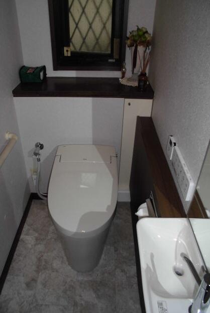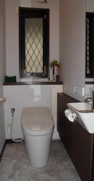 2年ほど前に2階のトイレを直したところ、出来上がりが良く気に入っていただき、特に悪い箇所はなかった1階のトイレも改装しました。 当初は今まで使わなかった手洗い器をなくしたいとのことでしたが、「来客の時に困りませんか?」と残すことを提案。 タンクレス便器にしたことで手前の空間が広くなったため、手洗い器を付けても抵抗はありません。内装も変えて気持ち良い空間になりました。