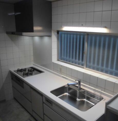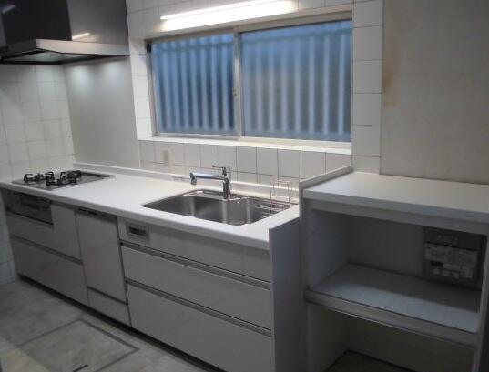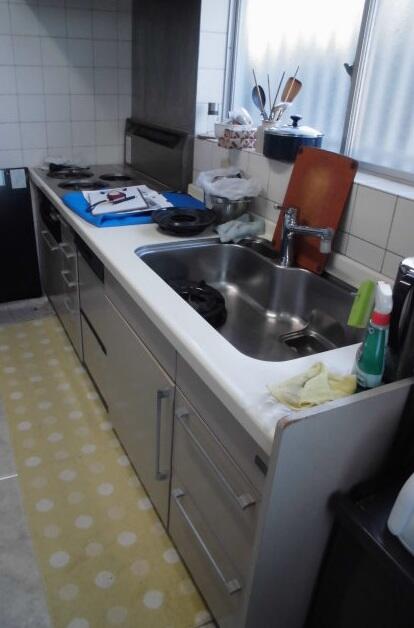リフォームのきっかけは、前のリフォームから25年経ち、全体に古くなった以外にコンロの部品が劣化したり、決定的だったのはフード内の換気扇が動かなくたったことです。 当社にて応急的に仮の換気扇を付けて使えるようにし、約4か月後に工事となりました。その間、気に入ったキッチンを探すため各ショールームを回り、納得のいくものを選定しました。壁のタイルは再利用しました。
