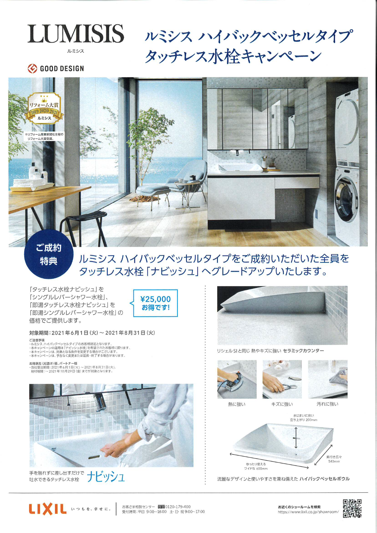 今日はルミシス ハイバックベッセルタイプのタッチレス水栓のキャンペーンのお知らせです。