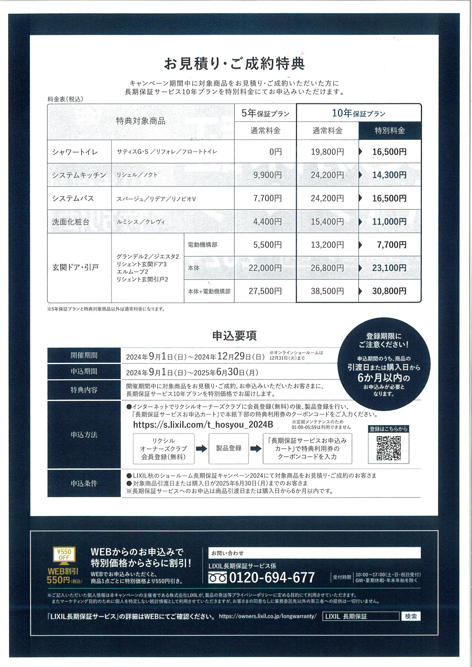 特典内容:開催期間中に対象商品をお見積り、ご成約、お申込みいただいたお客さまに、長期保証サービス10年プランを特別価格でお届けします。