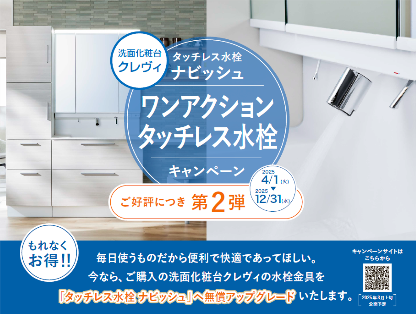 今なら、ご購入の洗面化粧台クレヴィの水栓金具を「タッチレス水栓ナビッシュ」へ無償アップグレードいたします。
