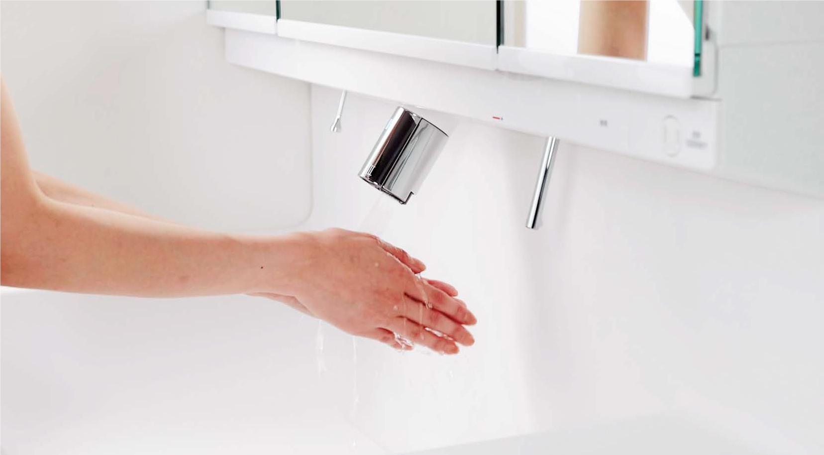手をふれずに差し出すだけでセンサーが感知し、自動で水が出てきます。