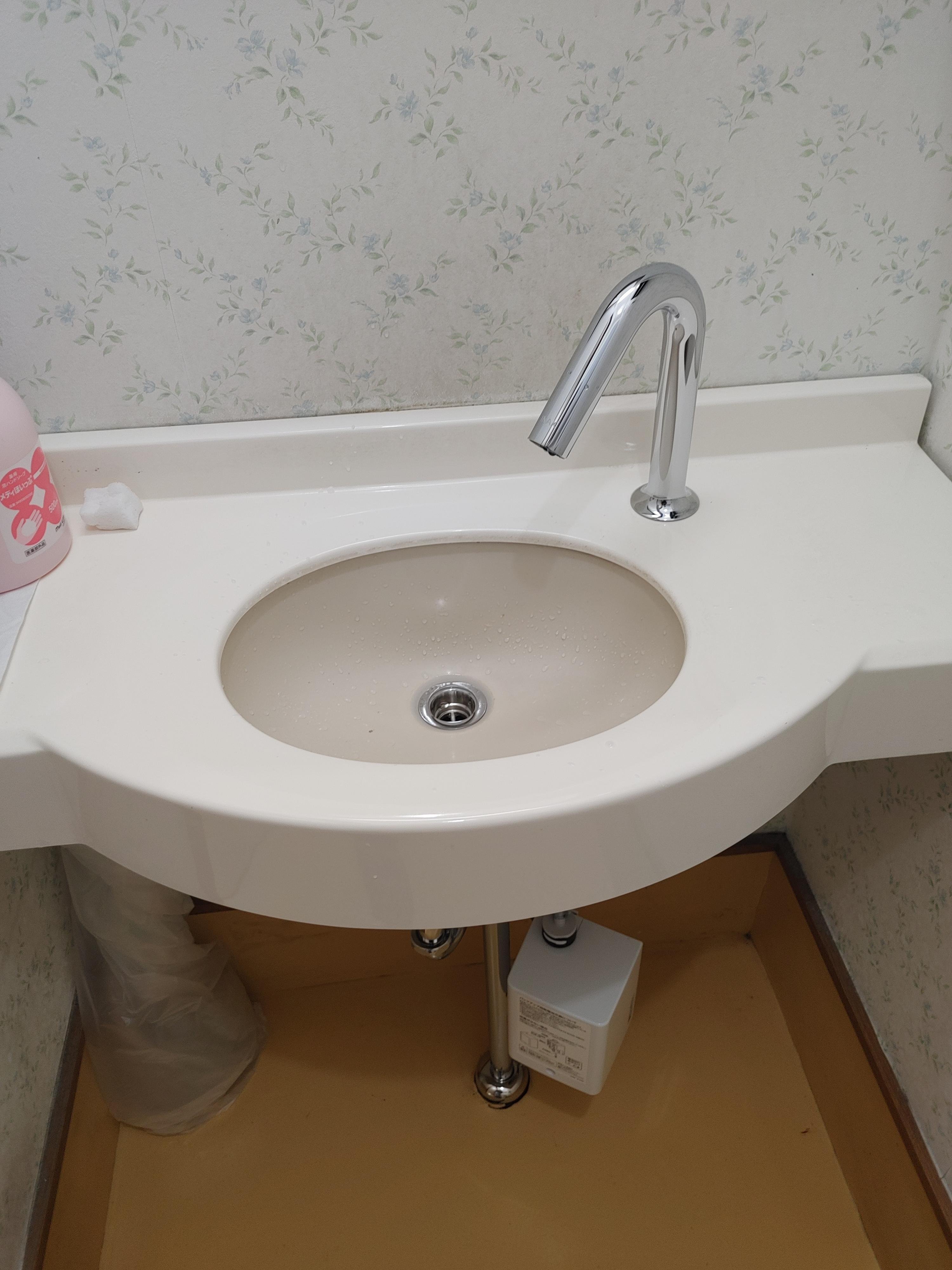 洗面台の手動水栓を自動水栓に交換させて頂きました。 感染防止対策として衛生面を大事にされている薬局様からのご要望でした。 自動水栓は電源工事が必要となりますが、近くにコンセントが無かったため、 電源不要の水力(自己)発電方式のタイプ(アクエナジー)を採用させて頂きました。 来店されるお客様からもうれしいお声を聞くようで、とても喜ばれています。