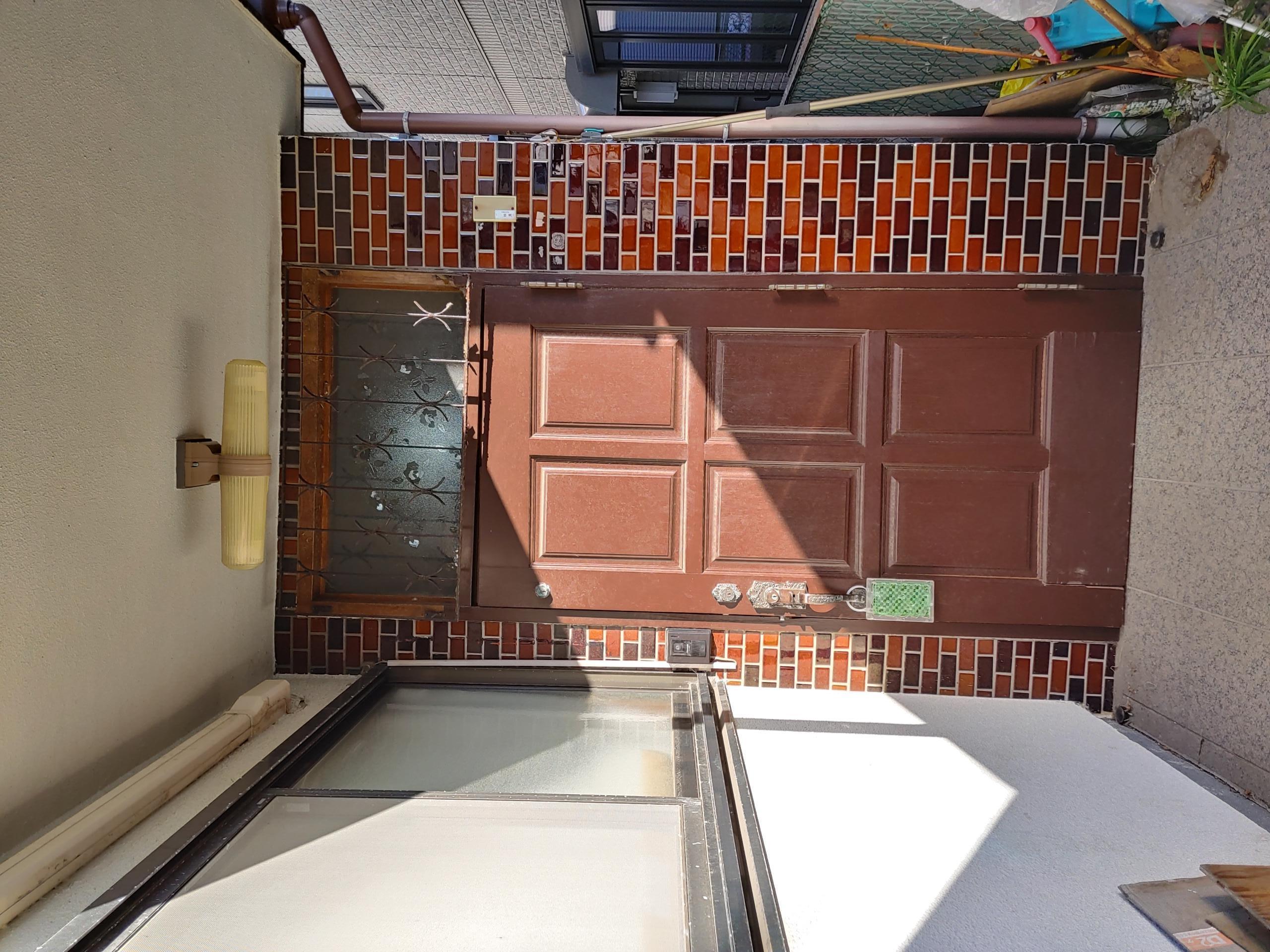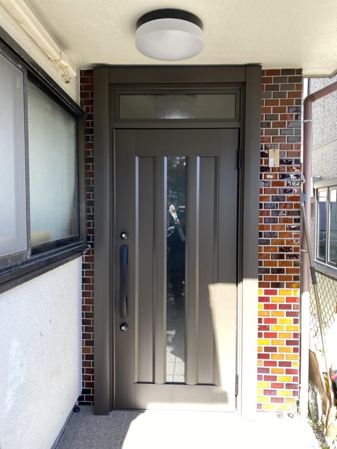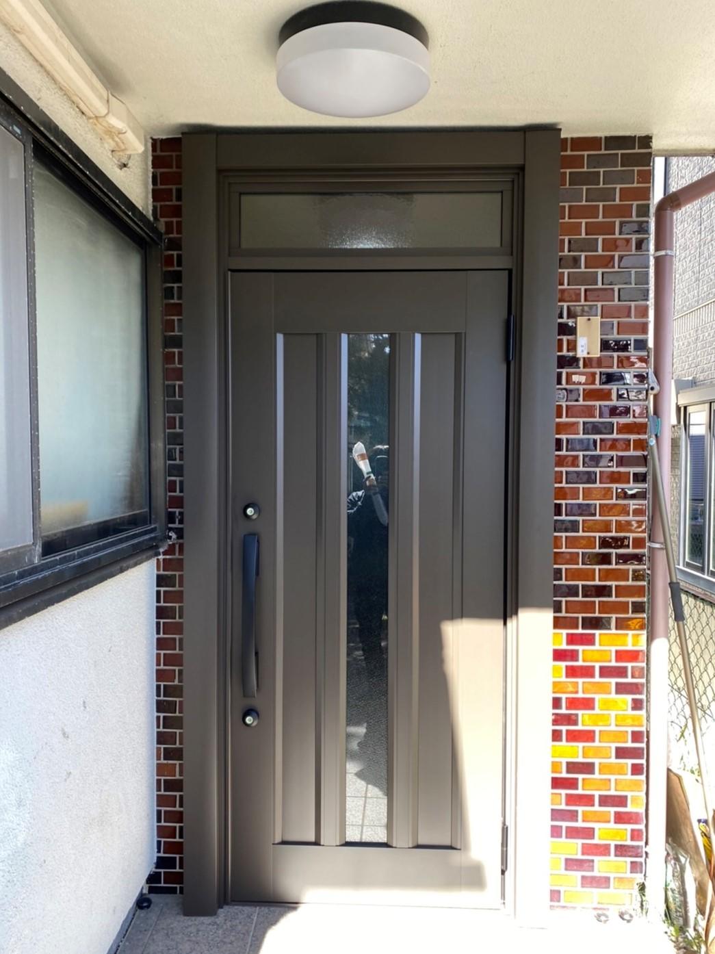 古くなった玄関ドアのお取替えです。 既存と同じドア上部のランマに加えドアはガラス入りタイプを選定されました。 玄関内がより明るくなりました。 落ち着いたオータムブラウンの色がドア横のタイル壁をより一層引き立たせてくれました。