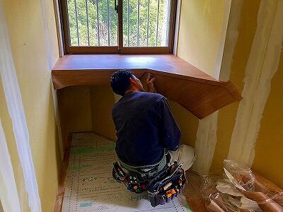 建物の形状をいかしてつけたカウンターには、ダイノックシートを貼っています。