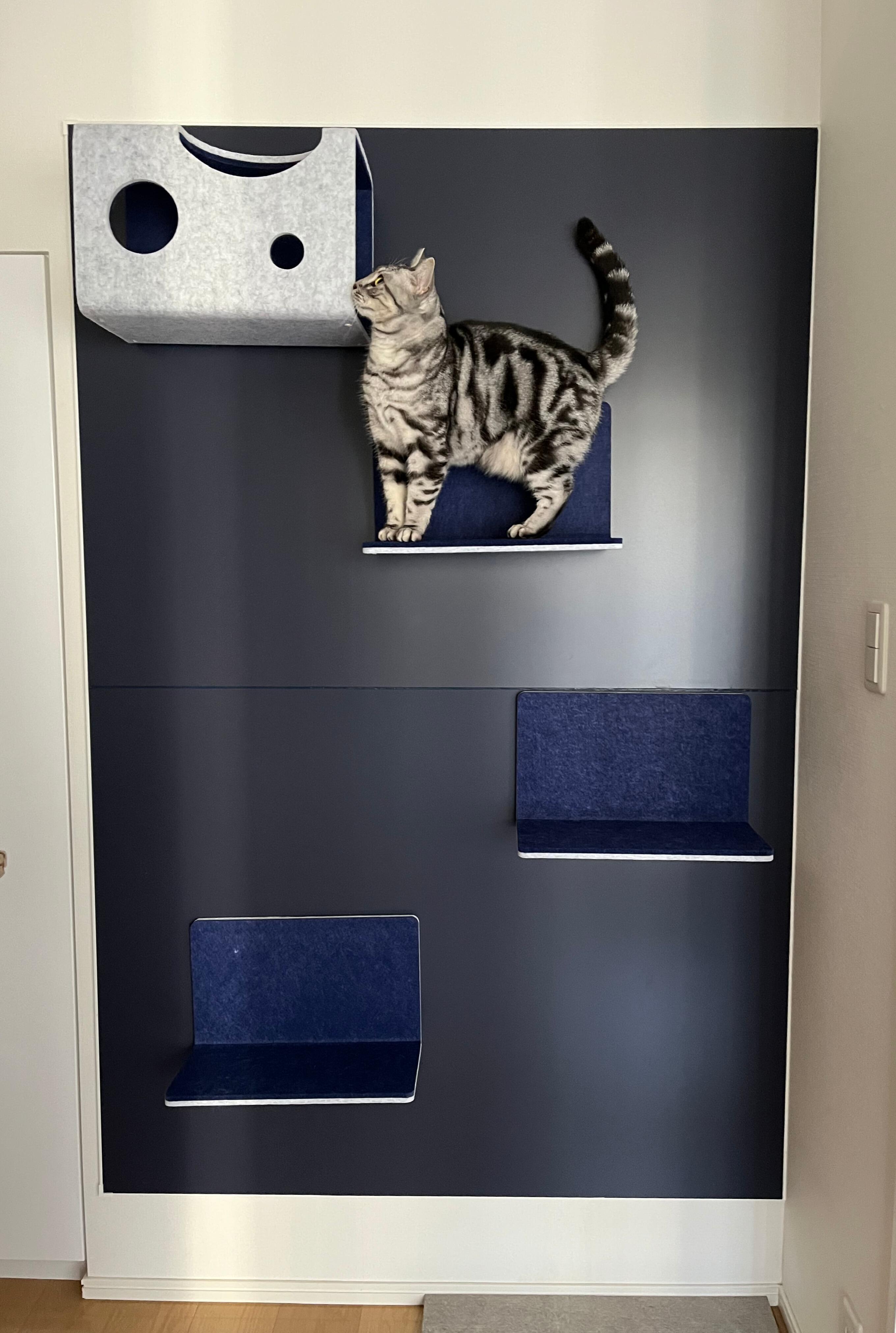 猫ちゃんと暮らされており、お部屋のインテリアや機能面を評価してくださりエコカラットプラス、愛猫のためにあたらしく遊べる環境にしてあげたく猫壁(にゃんぺき)の工事をご依頼いただきました。