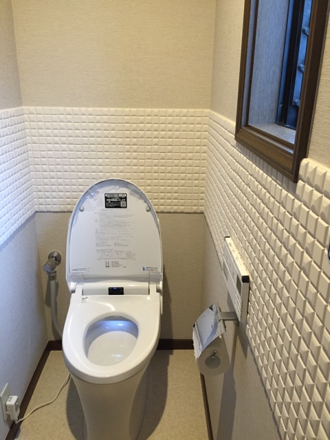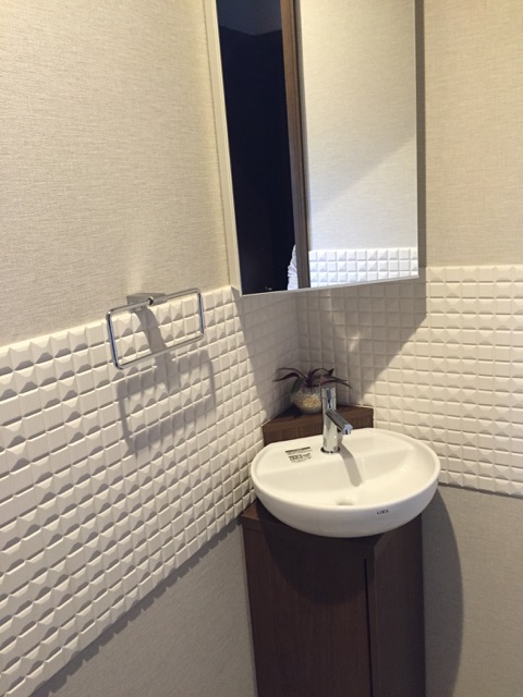 サティスS エコカラット(シェイリー):宝石のように当たっている照明の角度で印象が変わる、凸凹した加工がされているシャイリーを使用しました。手洗いの水はねが気になる前の壁から、帯状にぐるっとエコカラットを貼ることでアクセントになり、一気に引き締まった空間になりました。