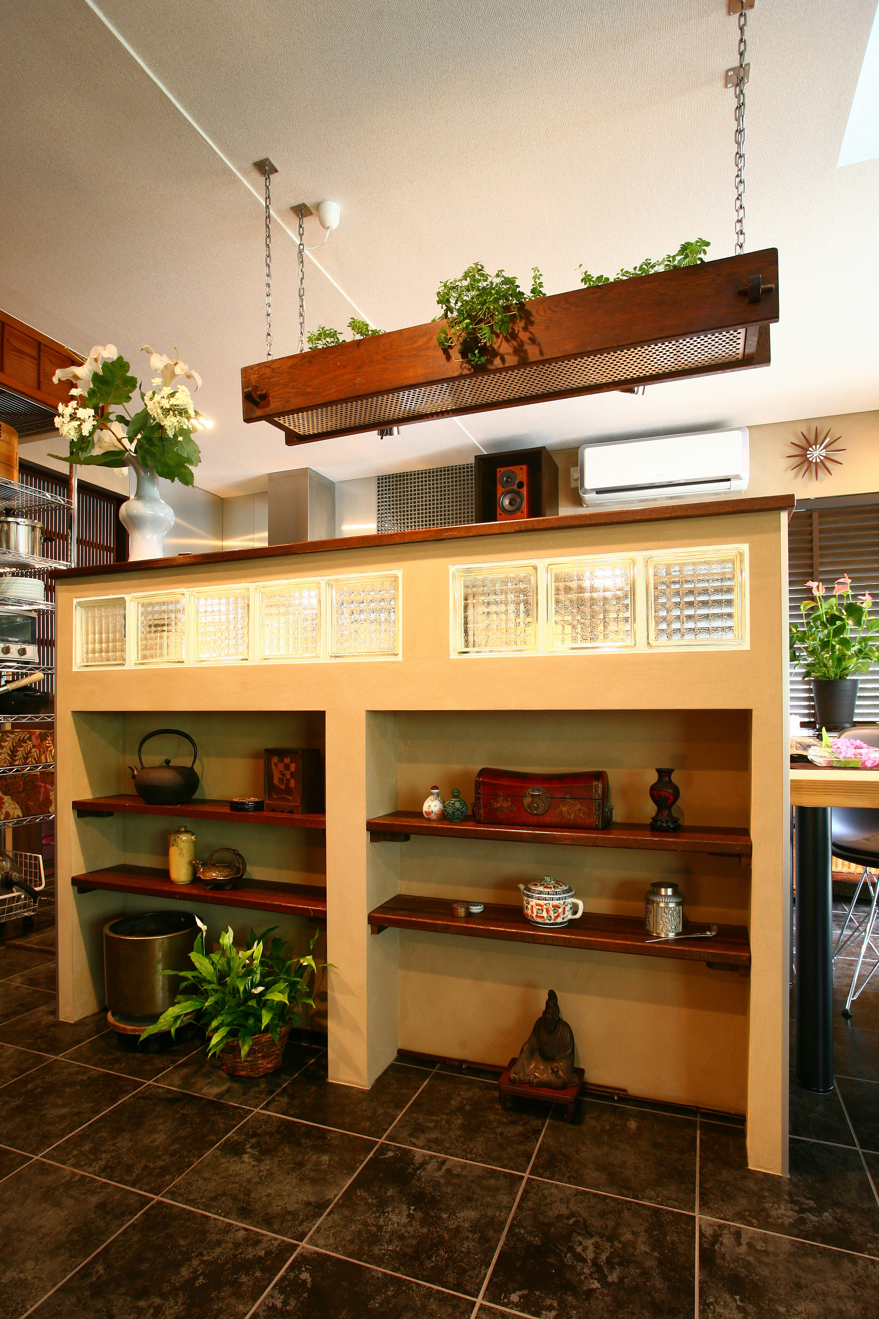 キッチン前には建具を再利用した収納棚を造作。奥さまが収集されたアンティークの小物を飾られています。