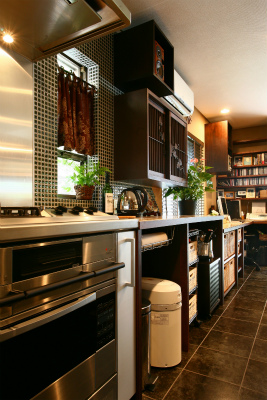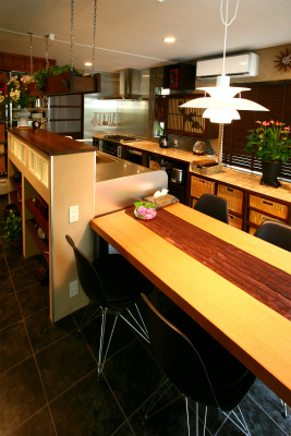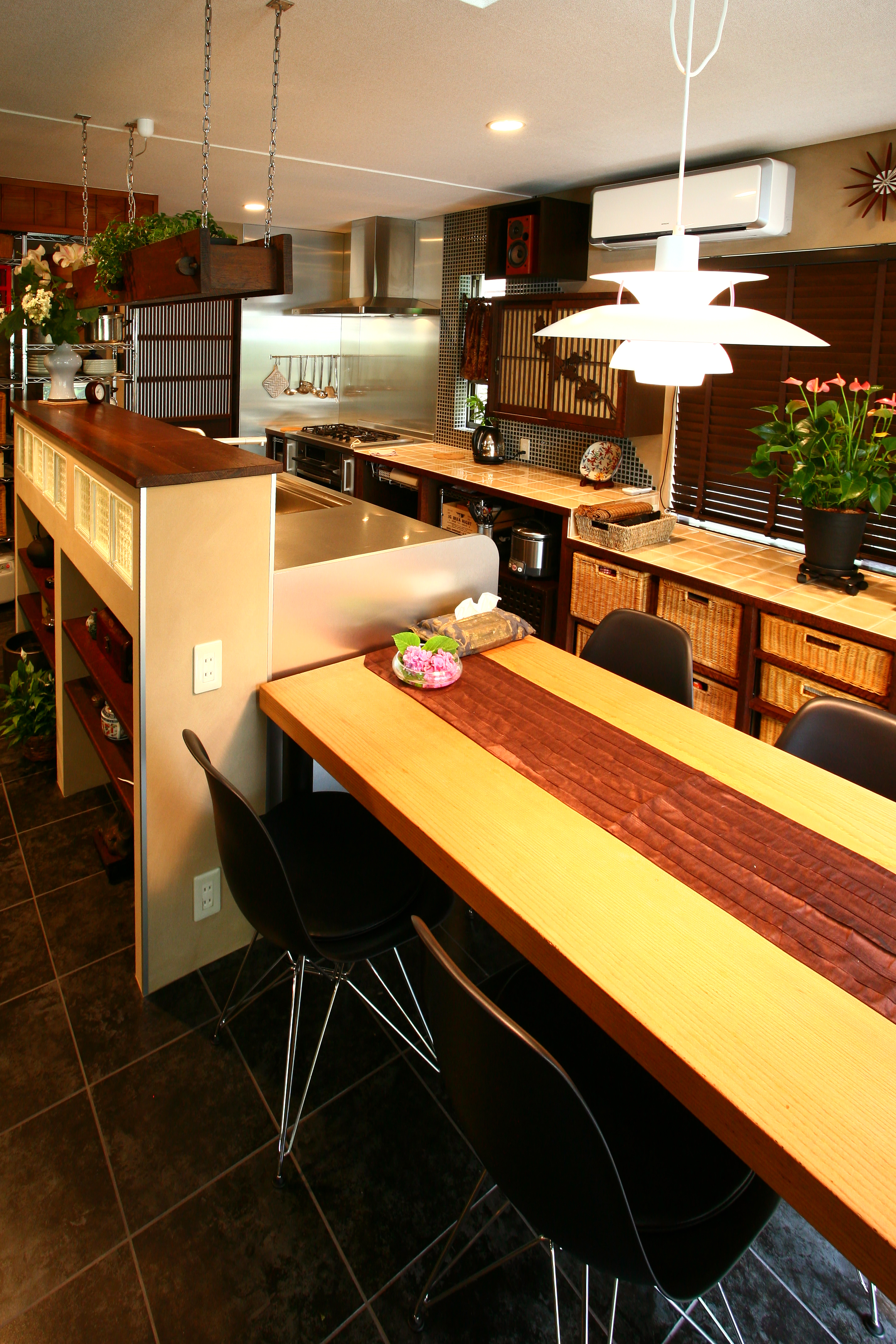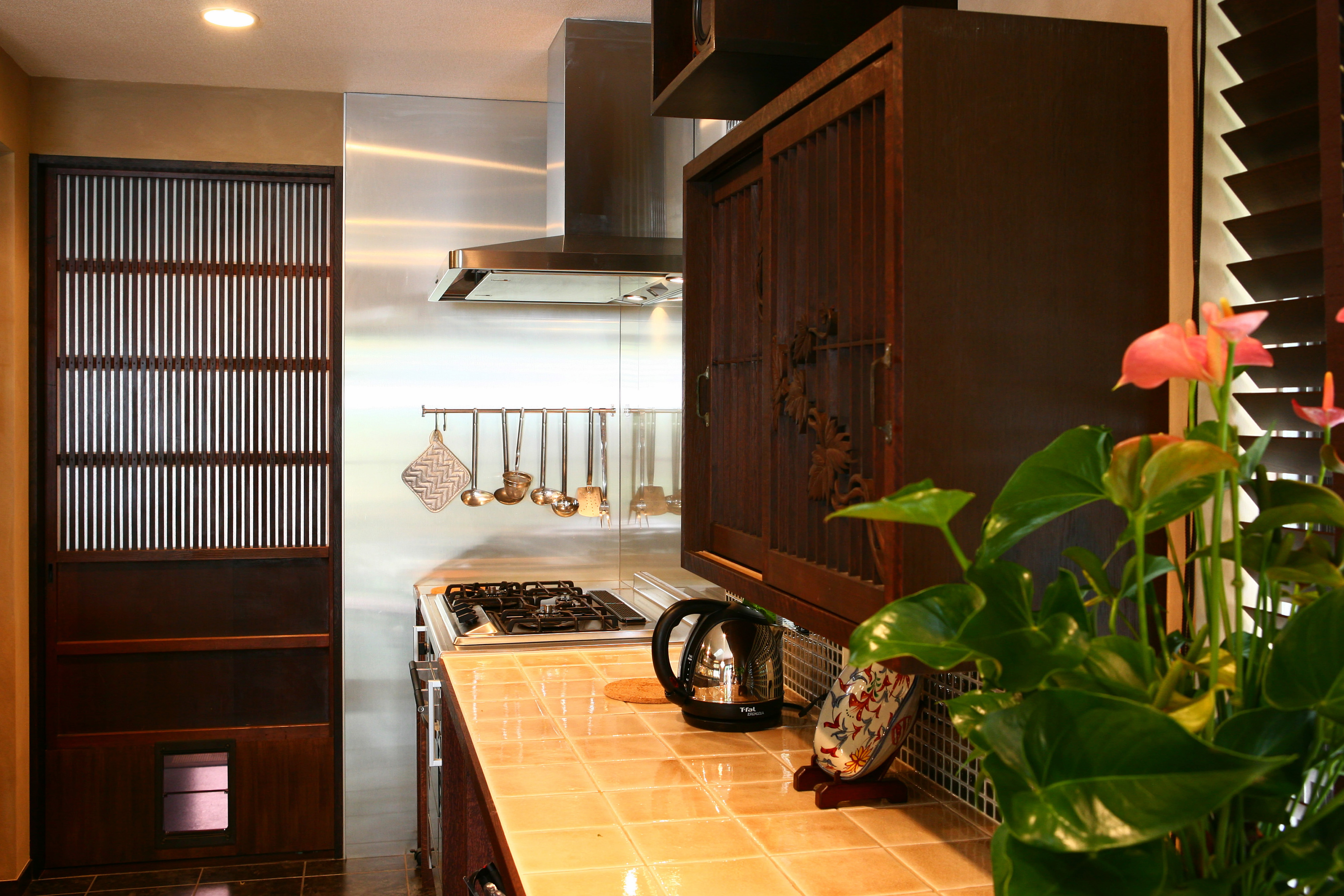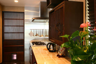 おもてなし空間のような、あたたかさのあるキッチン。建具や収納には古民具を利用しました。