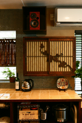 シンク背面のカウンターは、古民具と相性の良いタイルを使用。