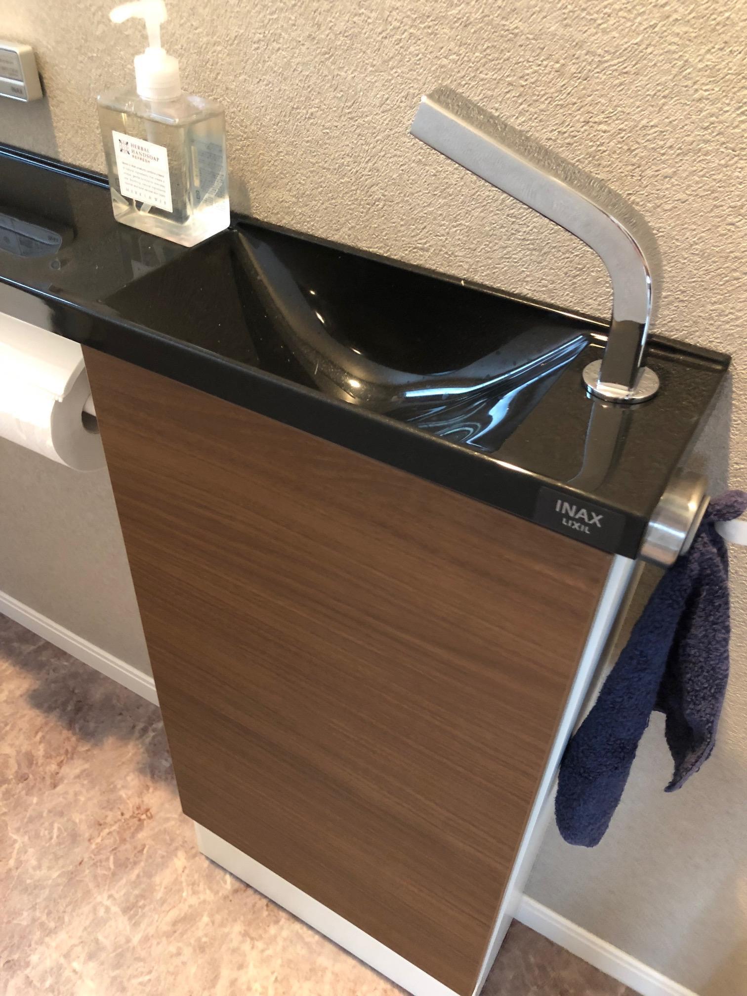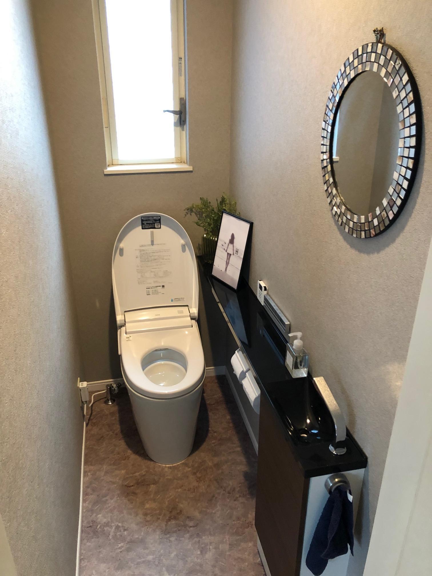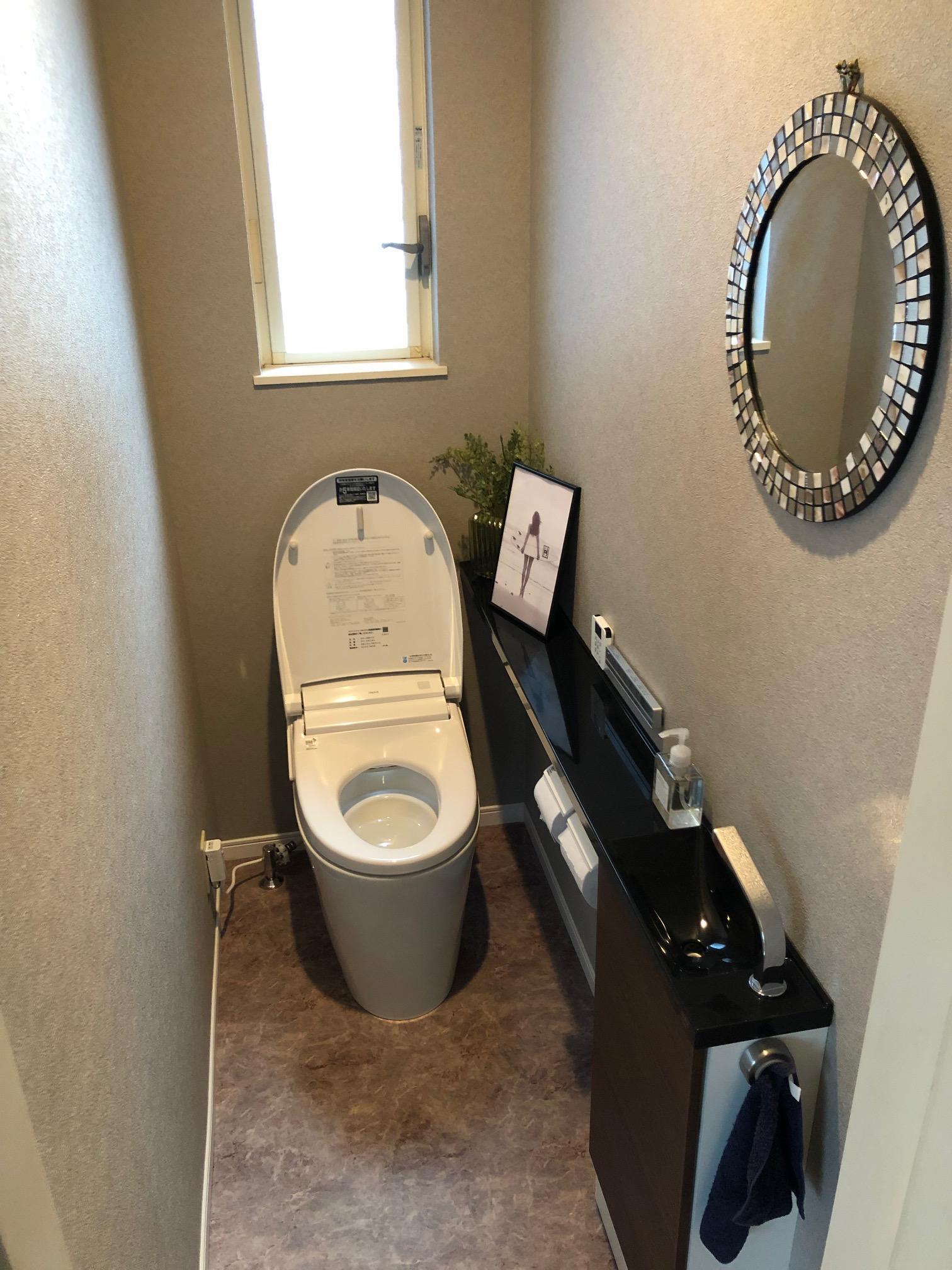 ■手洗いキャビネット:キャパシアを採用。トイレ空間をデザインしやすい設計になっており、ちょっとした収納も出来たりします。元々製品についている化粧鏡やタオルリングは今回不要でしたので、外すことでトイレ空間を自由にデザインしていただくことが出来ました。 水栓は自動水栓を採用されており、ハンドルまわりが汚れず衛生的。