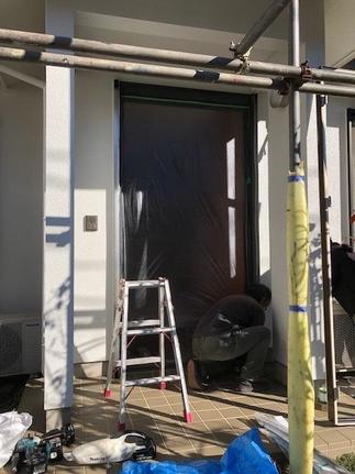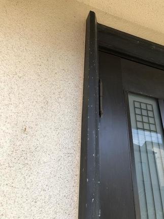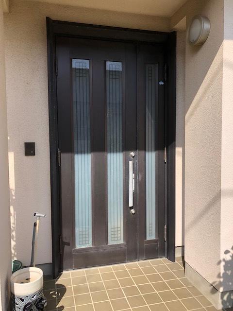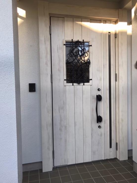 一見とても綺麗に見える玄関ドアでしたが、しおかぜにて劣化があり交換をお考えになりました。ダークブラウンのドアからエクリュアイボリー。玄関屋根をモスグリーン色に塗装し、明るくおしゃれな外観になりました。