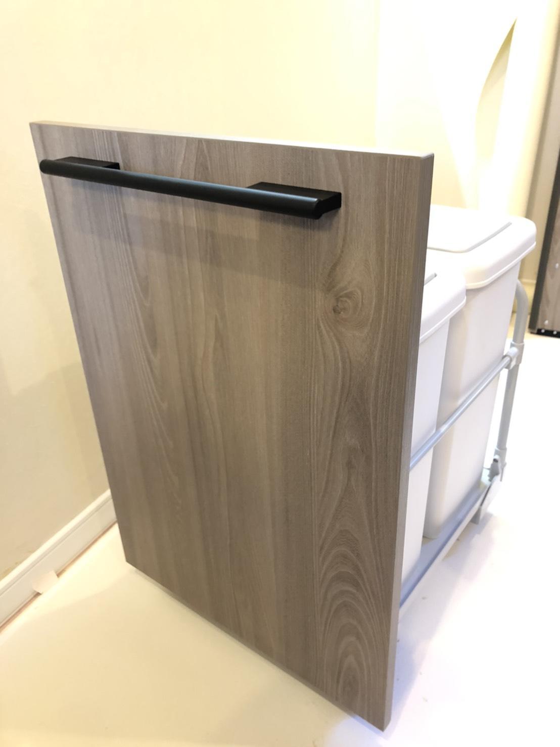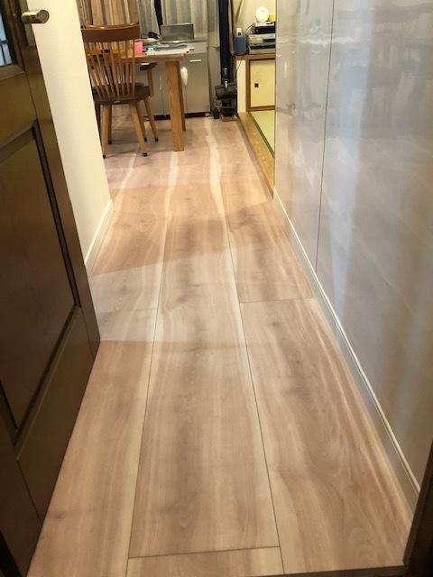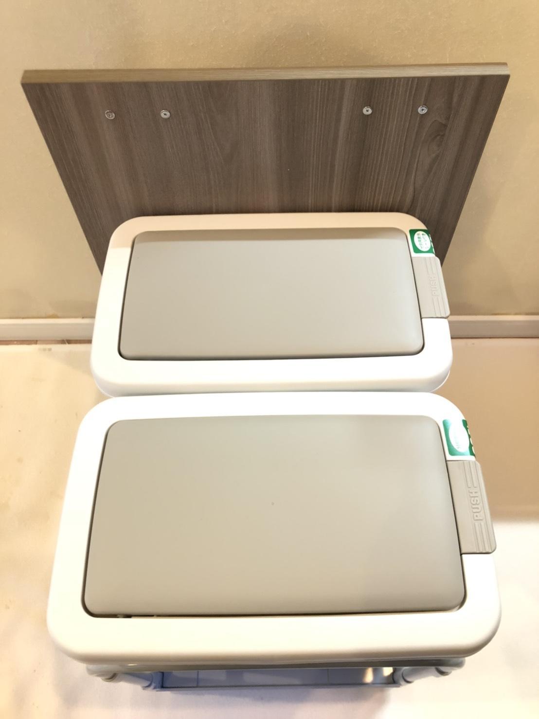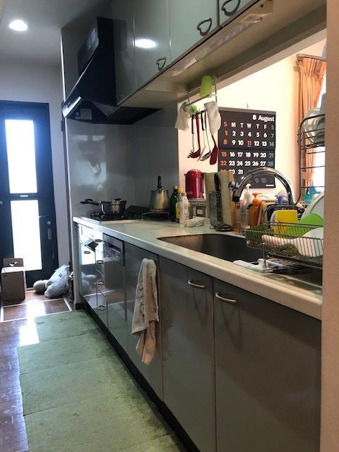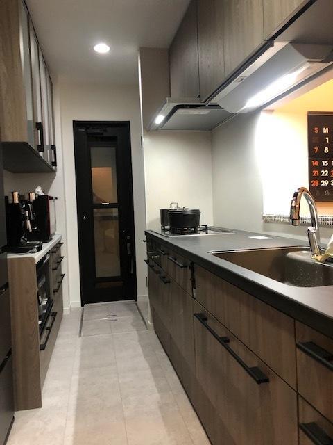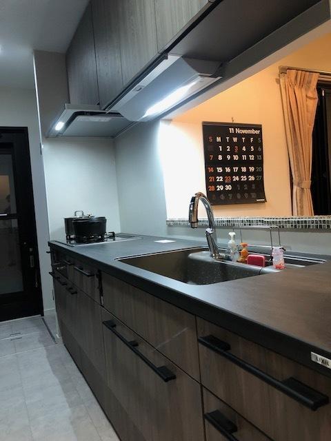 同時にバックセット・キッチン内のクロス・床貼替をしました。新規キッチンでは、衛生管理をされたいという事でシンク横W45cmのスペース確保し、魚やお肉の下処理する調理スペースを分けました。また、その下のキャビネットはダストボックスが収納できるダストワゴンを設置。面材が統一されているので外から見てもダストワゴンがバレません!清掃性が良く機能的なキッチンがご希望で、清掃しやすいハイブリットクォーツシンクを選ばれました。ワークトップは傷、熱に強いセラミックトップ。バックセットと面材を統一され一体感のある空間に仕上がりました。