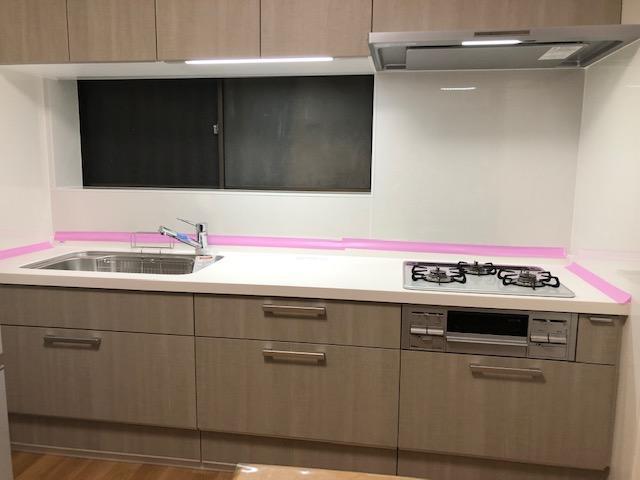 新規に設置したキッチン。ワークトップはインテリアになじみやすい人造大理石。色はシンプルホワイト。シンクは長年使いなれているステンレス。