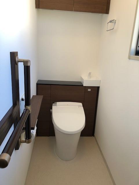 収納扉の色をクリエダーク、ピンクのトイレよりオフホワイト。既存の手すりを一部残し紙巻器付き手すりを取付。床はサンゲツクッションフロアーのHM-15158 壁クロスはLBX-9489