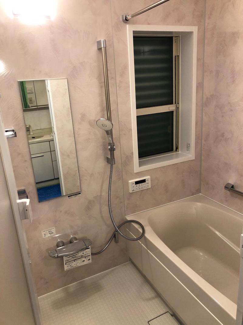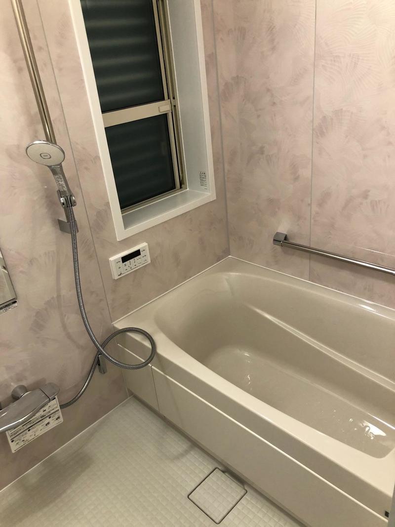 断熱性能の高い浴室・浴槽のユニットバス、【スパージュ】をご採用いただきました。 洋風調の外観と内装が素敵なご自宅にピッタリな、薄いピンク+レリーフ調の【プリーツ】のご選定も奥様のセンスが光っております。