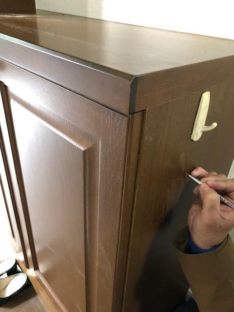 下駄箱収納側面に傷が付いてしまい、30年もお使いになっていたので買い替えもお考えされていましたが【リペア】で補修することになりました。 【リペア】って何?【リペア】➡修理、補修、手直しのことです。 お安い費用で、工期が短く、ごみが出なく環境にも優しい【リペア】 ちょっとした傷なら、すっきり綺麗になりますよ。