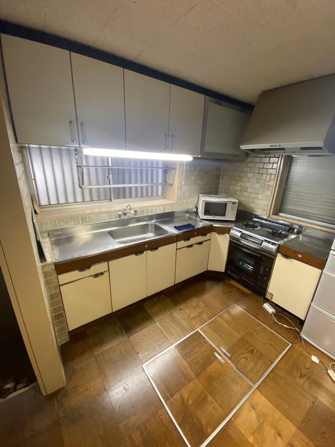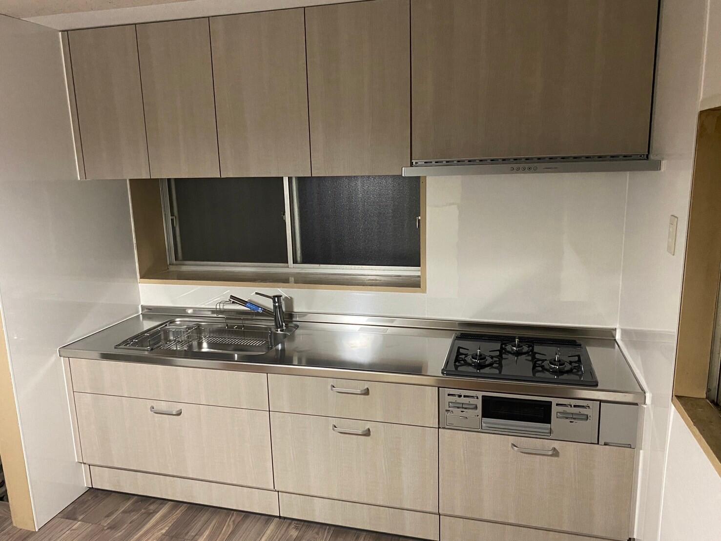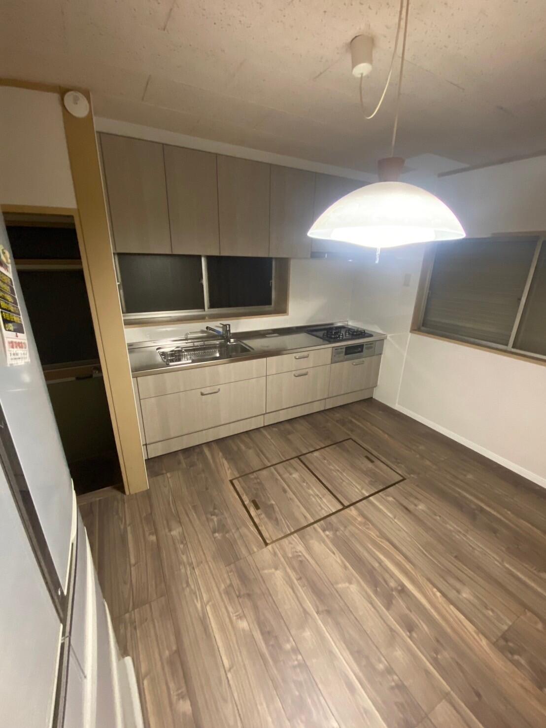 既存のキッチンを解体して、床のフローリング張り替え、 壁のクロス張り替えも行いました。