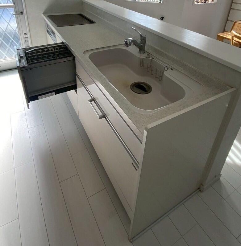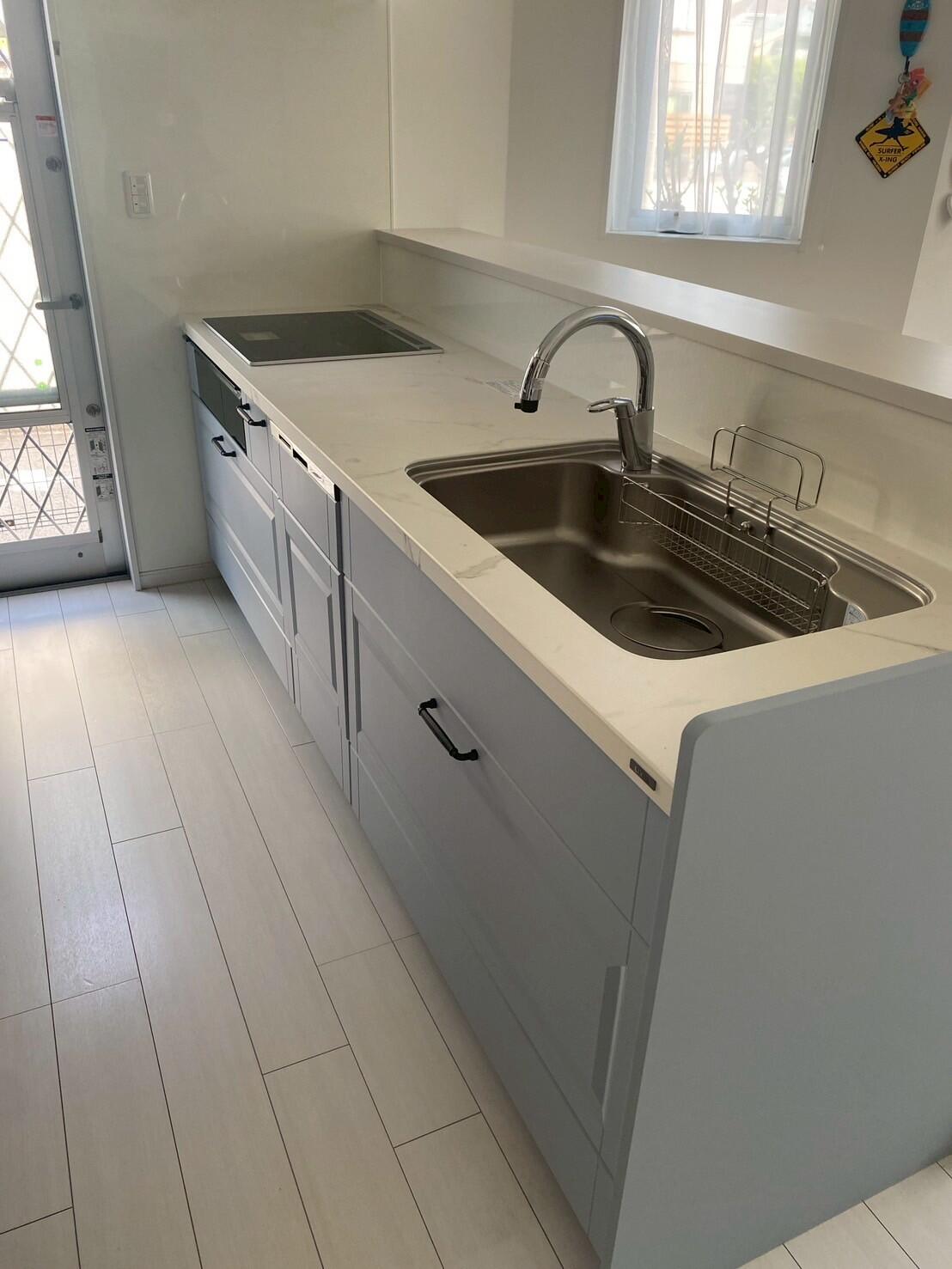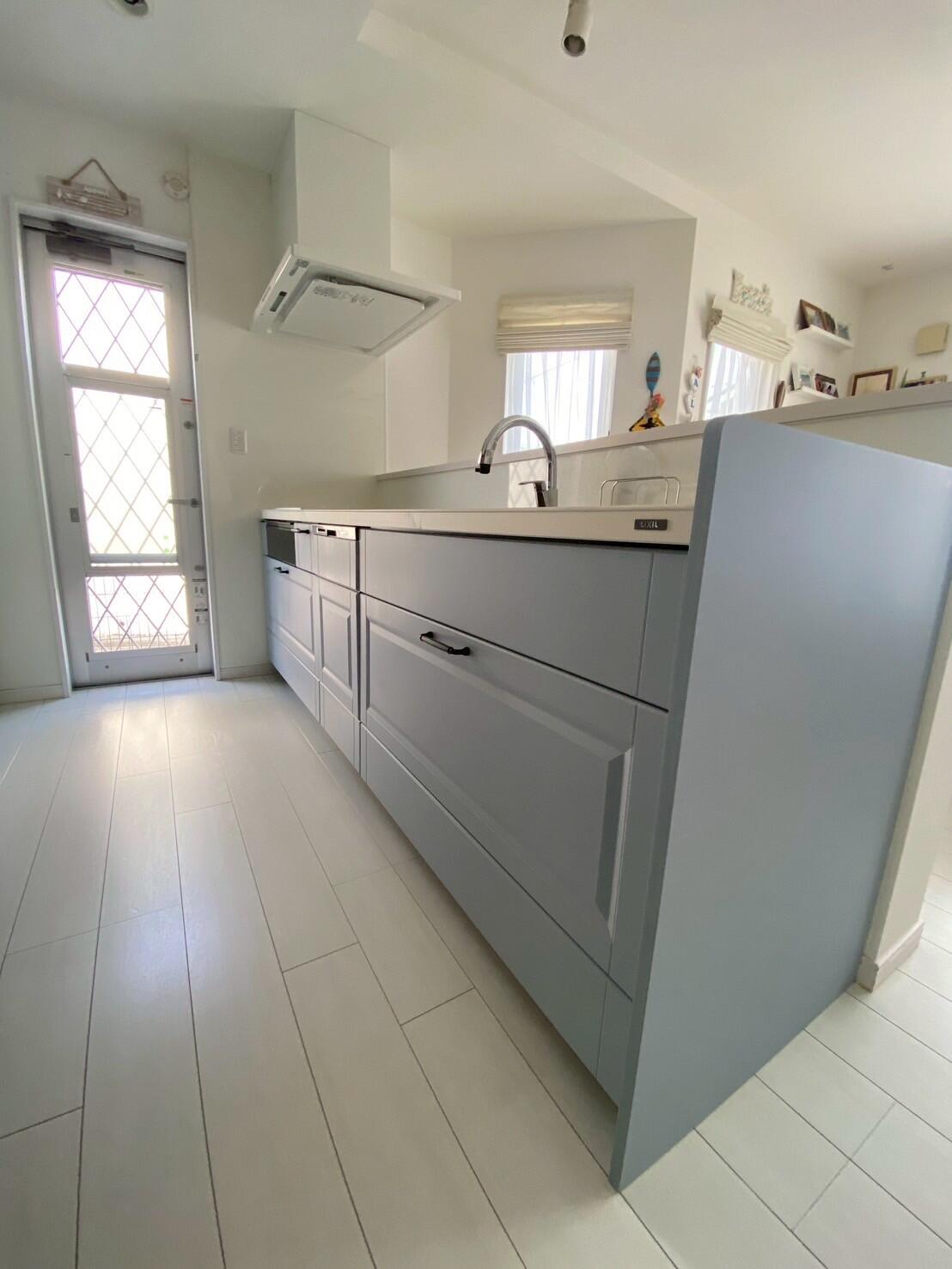 既存キッチンを解体し、キッチン前カウンターも一緒に生まれ変わりました。 カラーはシエルブルーで更に素敵なカラーへ。