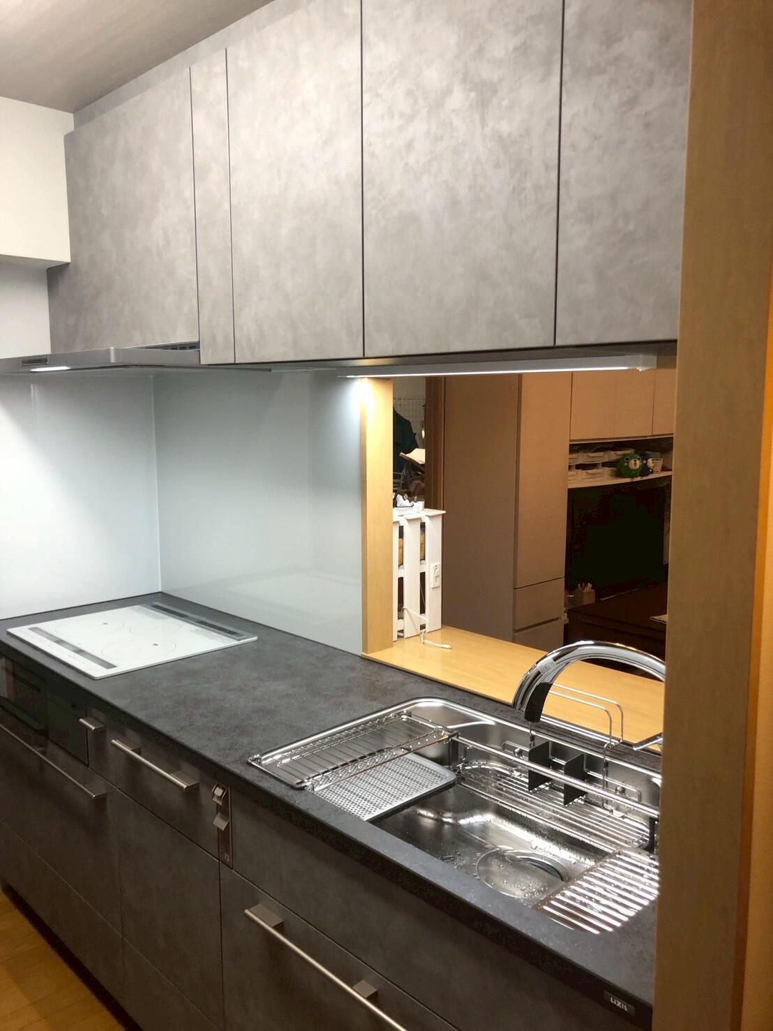既存のキッチンを解体し、人気のセラミックトップのキッチンに生まれ変わりました。 カラーはグレージュスタッコで更にクールな印象に。
