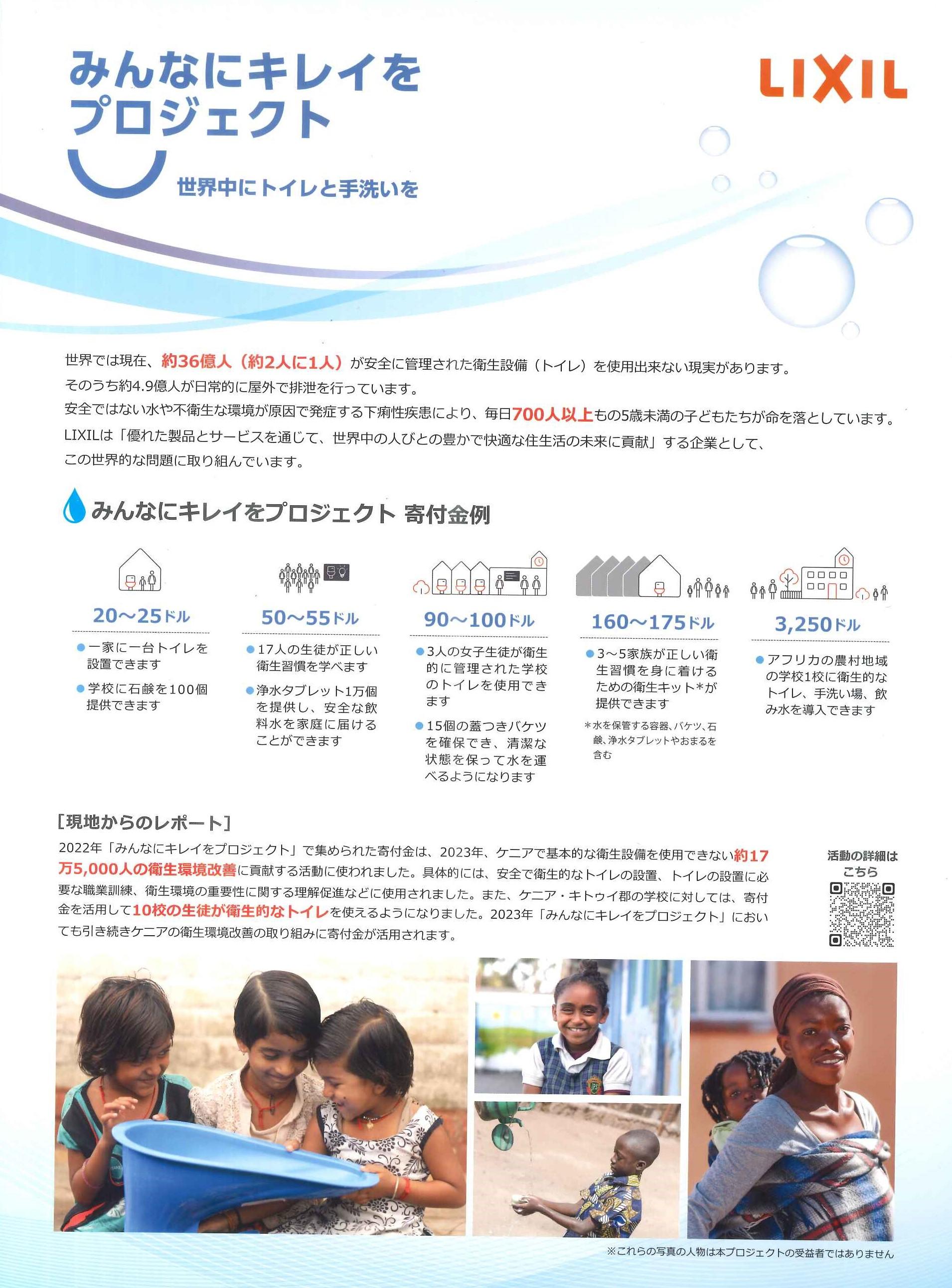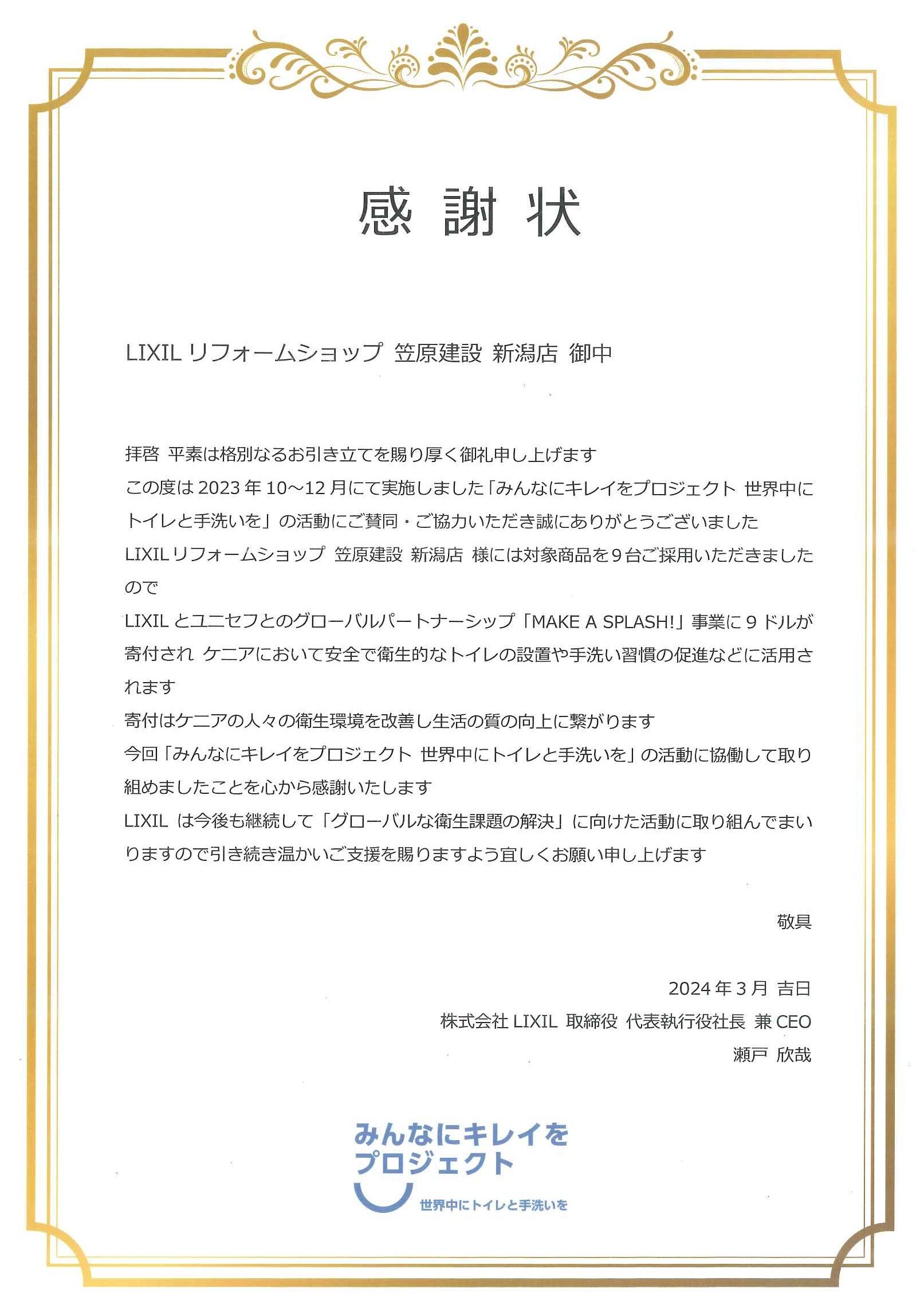 「みんなにキレイをプロジェクト 世界中にトイレと手洗いを」の活動に賛同し、感謝状もいただきました!