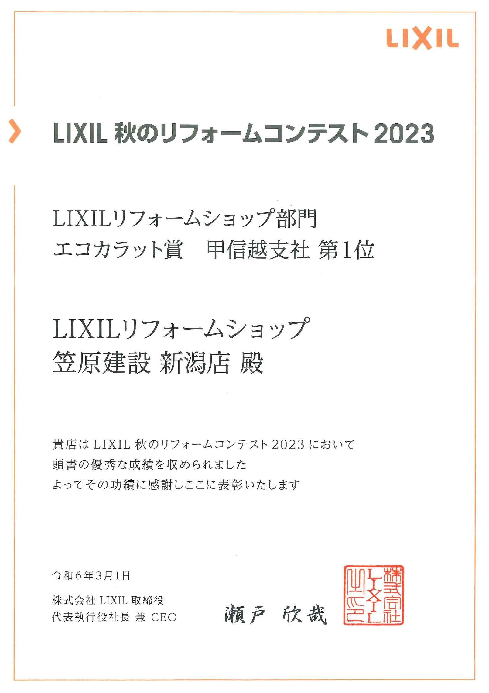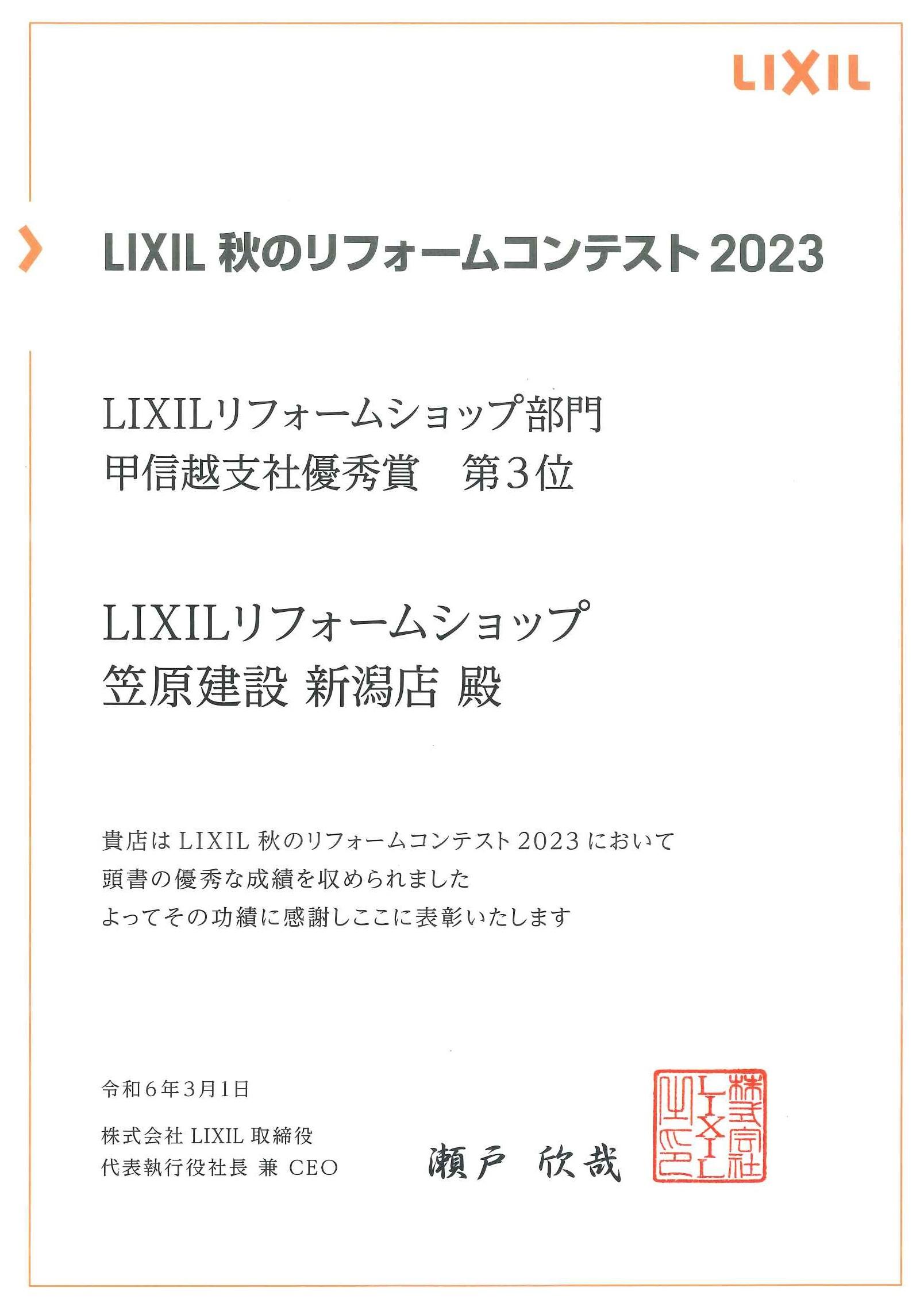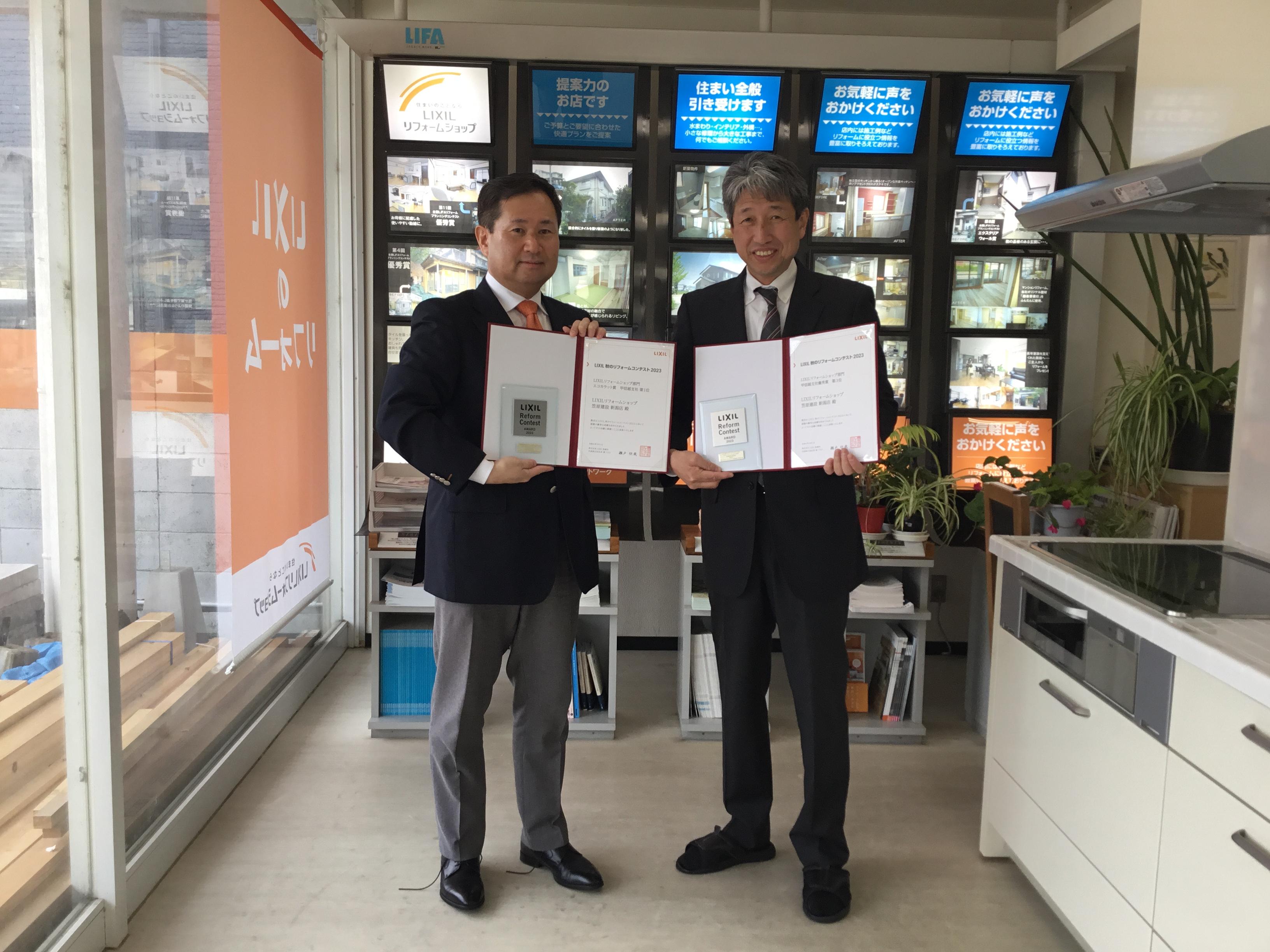 この度 笠原建設 新潟店は、LIXIL主催の2023「秋のリフォームコンテスト」LIXILリフォームショップ部門で