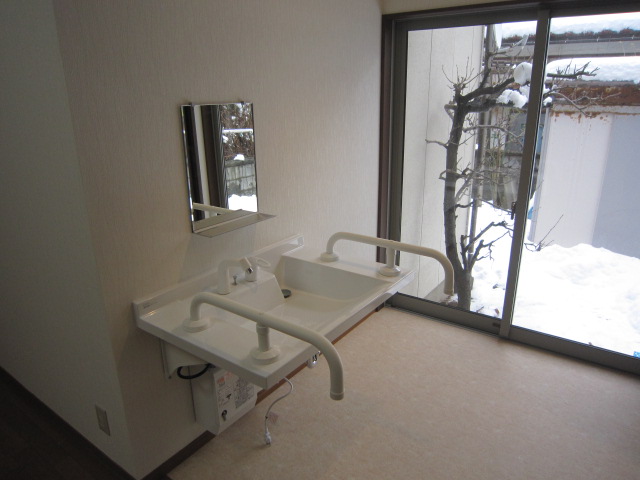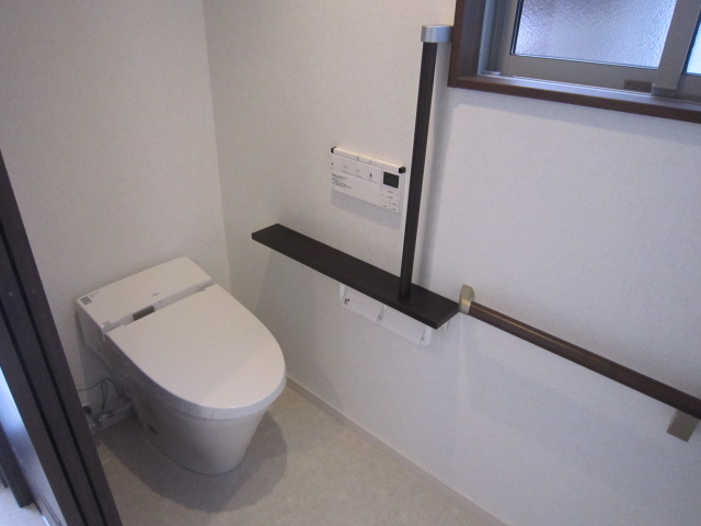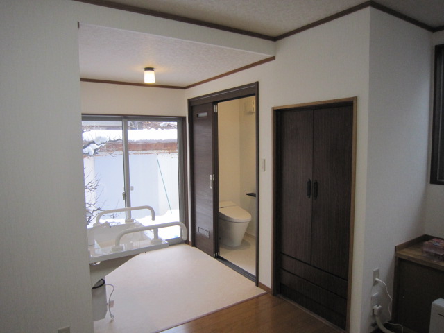 和室と広縁をワンルームの洋室(寝室)へ改装し、広縁部分にトイレと車いす対応の洗面台を新設しました。トイレは開口部を広くとれる3枚引き戸にし、使用する方が使いやすい位置に手すりを設置しました。床はフローリングですが、トイレと洗面部分のみ防滑性のある水に強い床材に張り分けました。