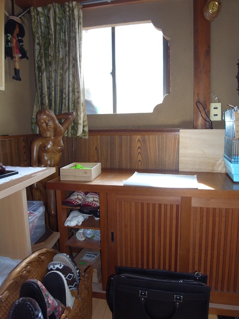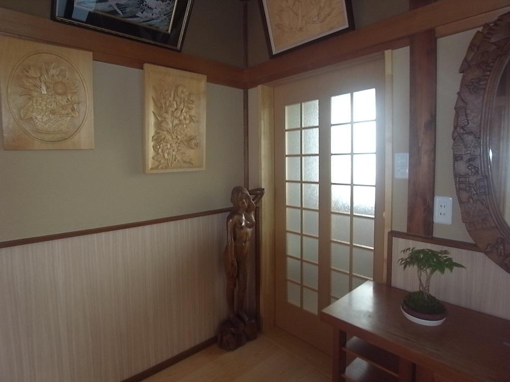 トイレが1カ所しかなく不便だったため玄関脇にもう1カ所増築しました。玄関が暗くならないようトイレの入口は格子のガラス戸にしました。