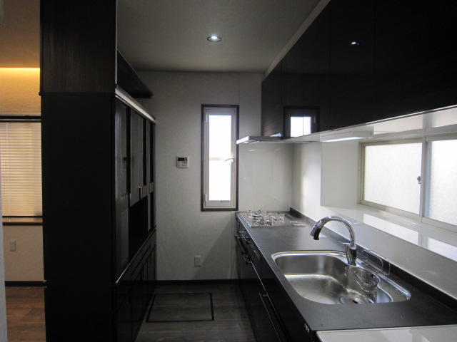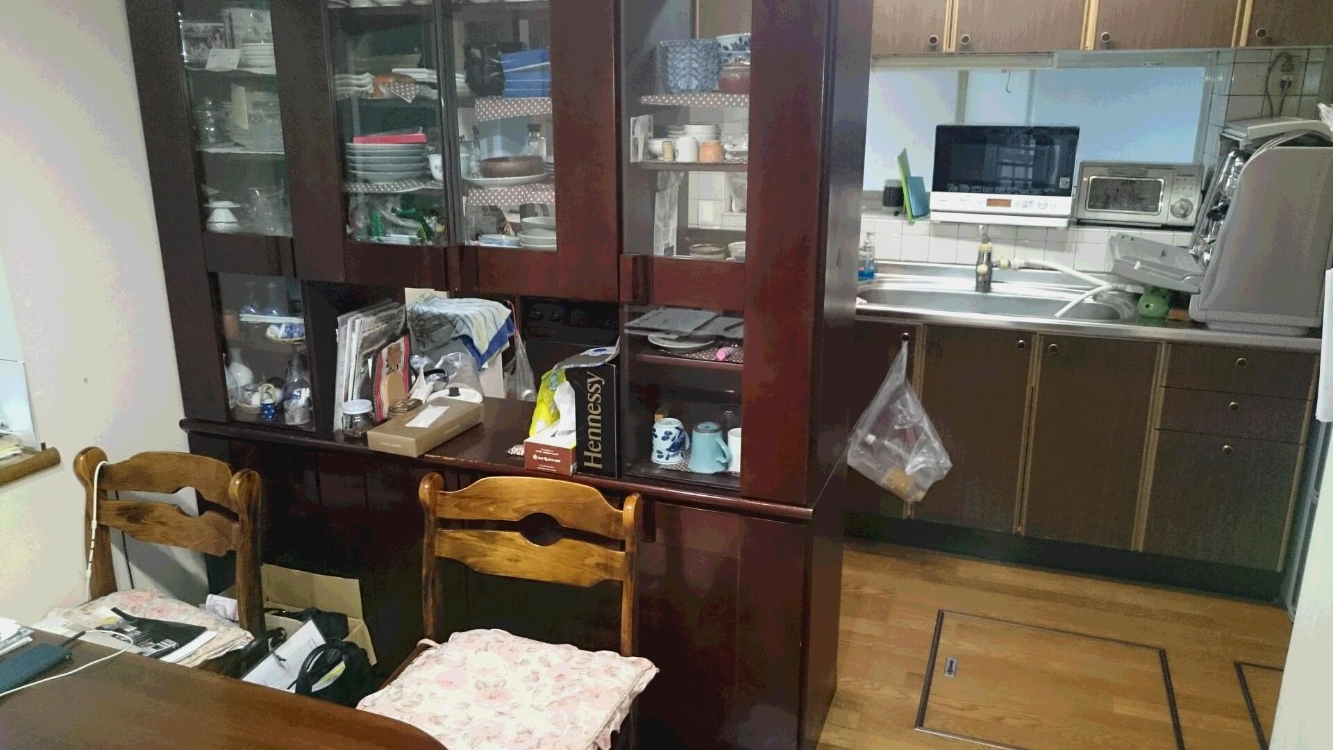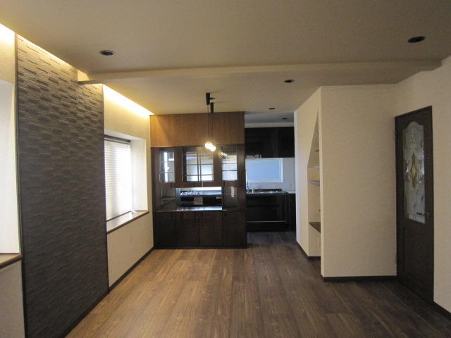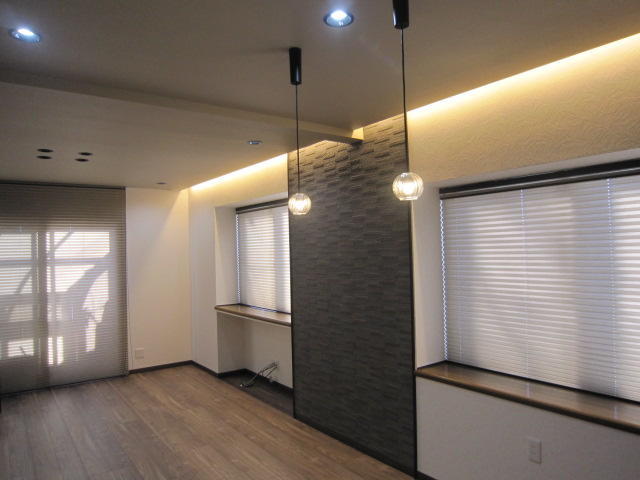 リビングとダイニングの間仕切り壁を撤去しワンルームのLDKにリフォームしました。キッチンは既存の位置のまま器具を入れ替え、もともとあった両面ハッチは少し手を加え残しました。窓際には壁にアクセントで張ったエコカラットを照らすように間接照明を設置しました。ダウンライトと間接照明でリラックスできる心地良い空間になりました。