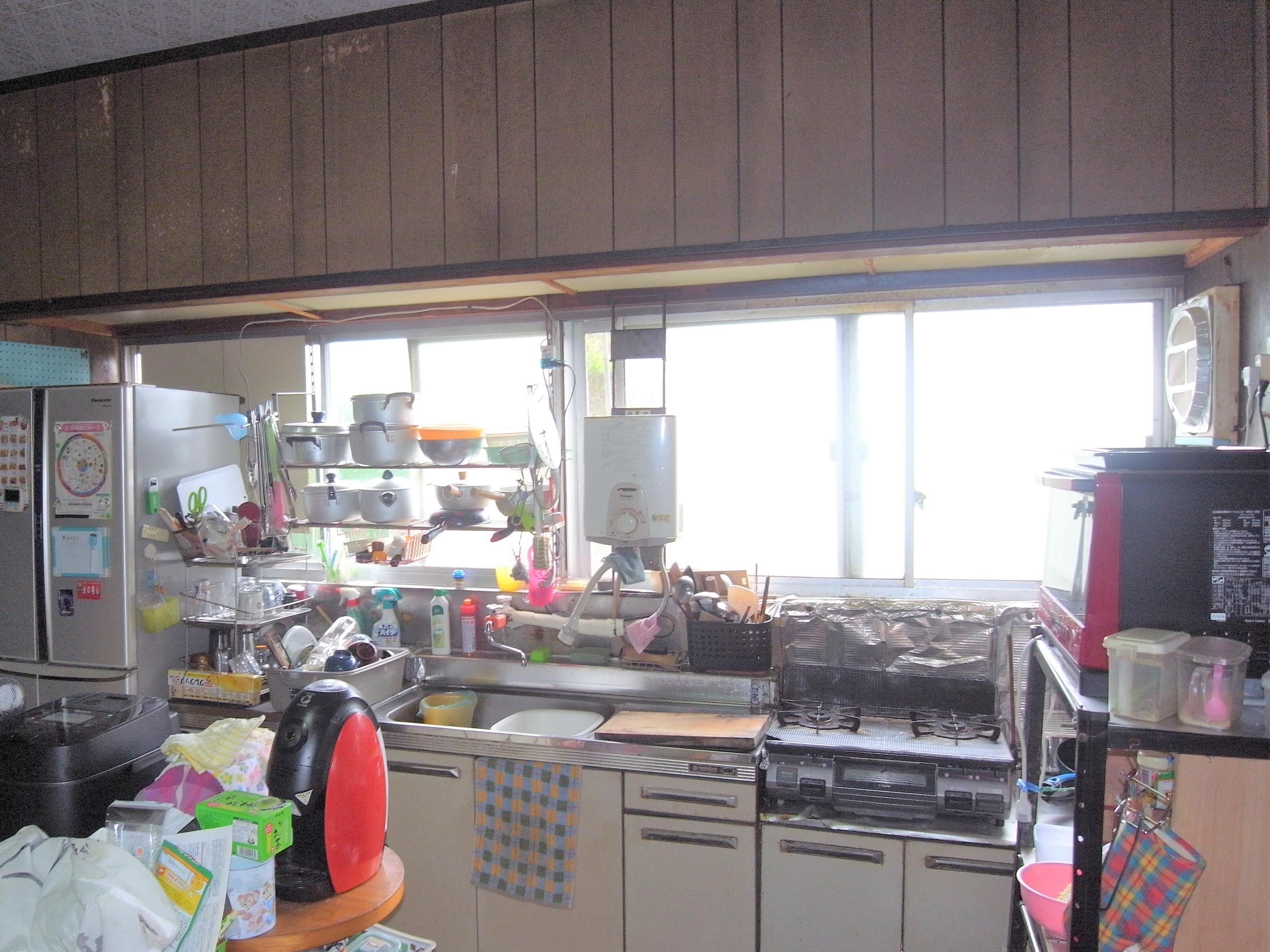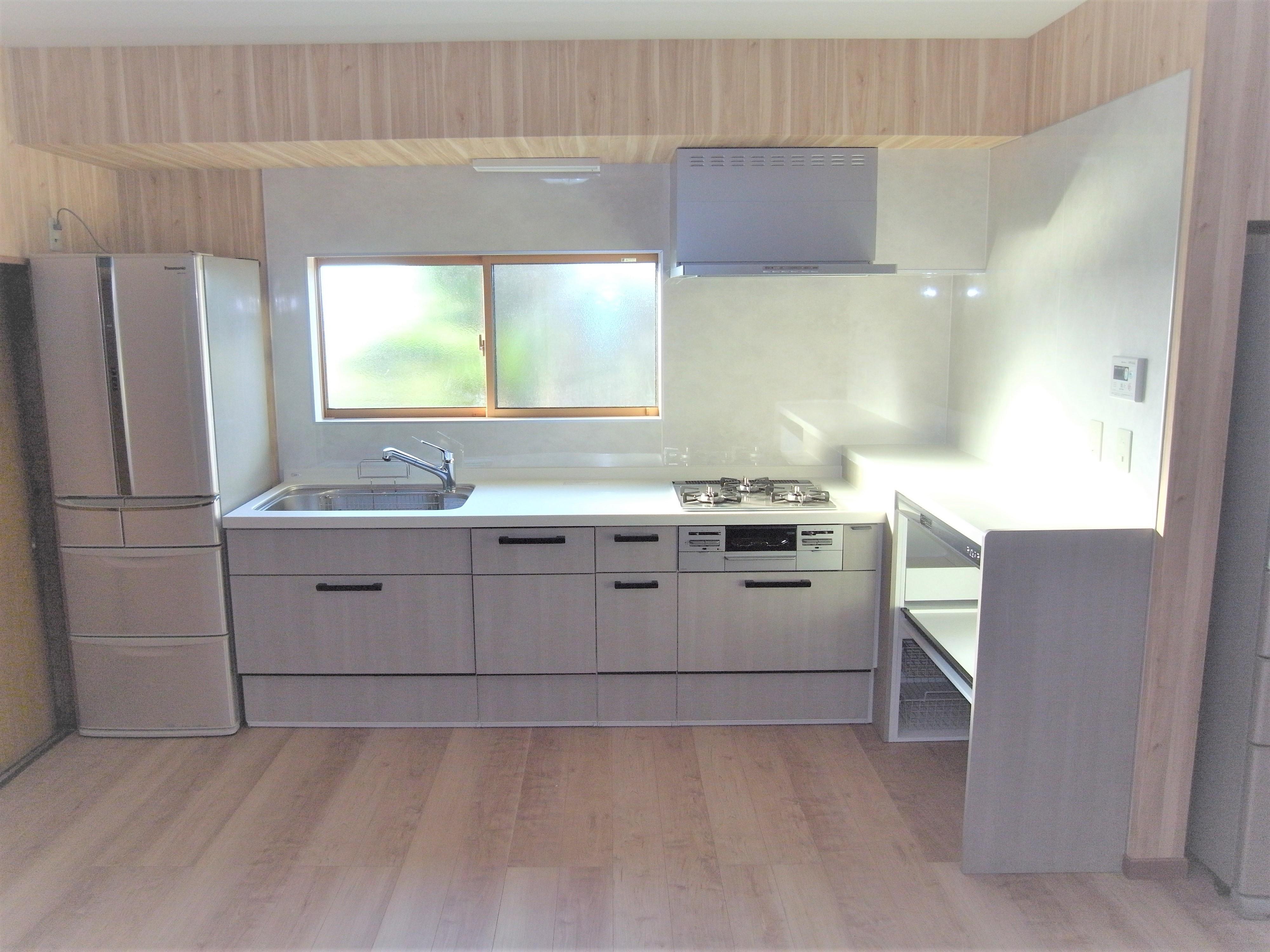 もともとダイニングキッチンは10帖ありましたが、ご家族が多く大きなダイニングテーブルを置いて食事をするには少し狭いスペースでした。またキッチンもセパレートタイプの流し台で瞬間湯沸し器もあったため、使い勝手が悪く収納スペースも足りませんでした。そこで、隣の部屋との間仕切りを撤去し14.5帖のダイニングキッチンに広げ、流し台も収納量の多いシステムキッチンに入れ替えました。配置は使い慣れた既存と変えず、レンジなどの家電スペースをL型にし、冷蔵庫からシンク、調理台、コンロと配置し、レンジフードを設置するために窓も入れ替えました。また、ユニットバスと洗面台、給湯器も合わせて工事しました。